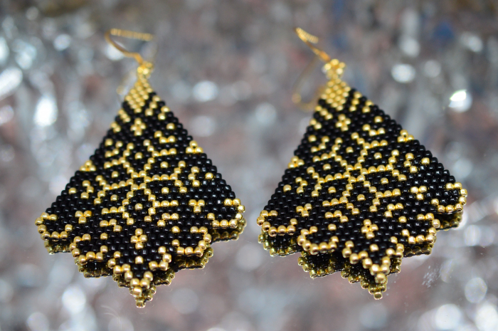 Un model cu energie veche. Forma romboida si contrastul dintre margelele metalice si fundalul negru ii fac sa para mai mult un simbol decat un accesoriu.