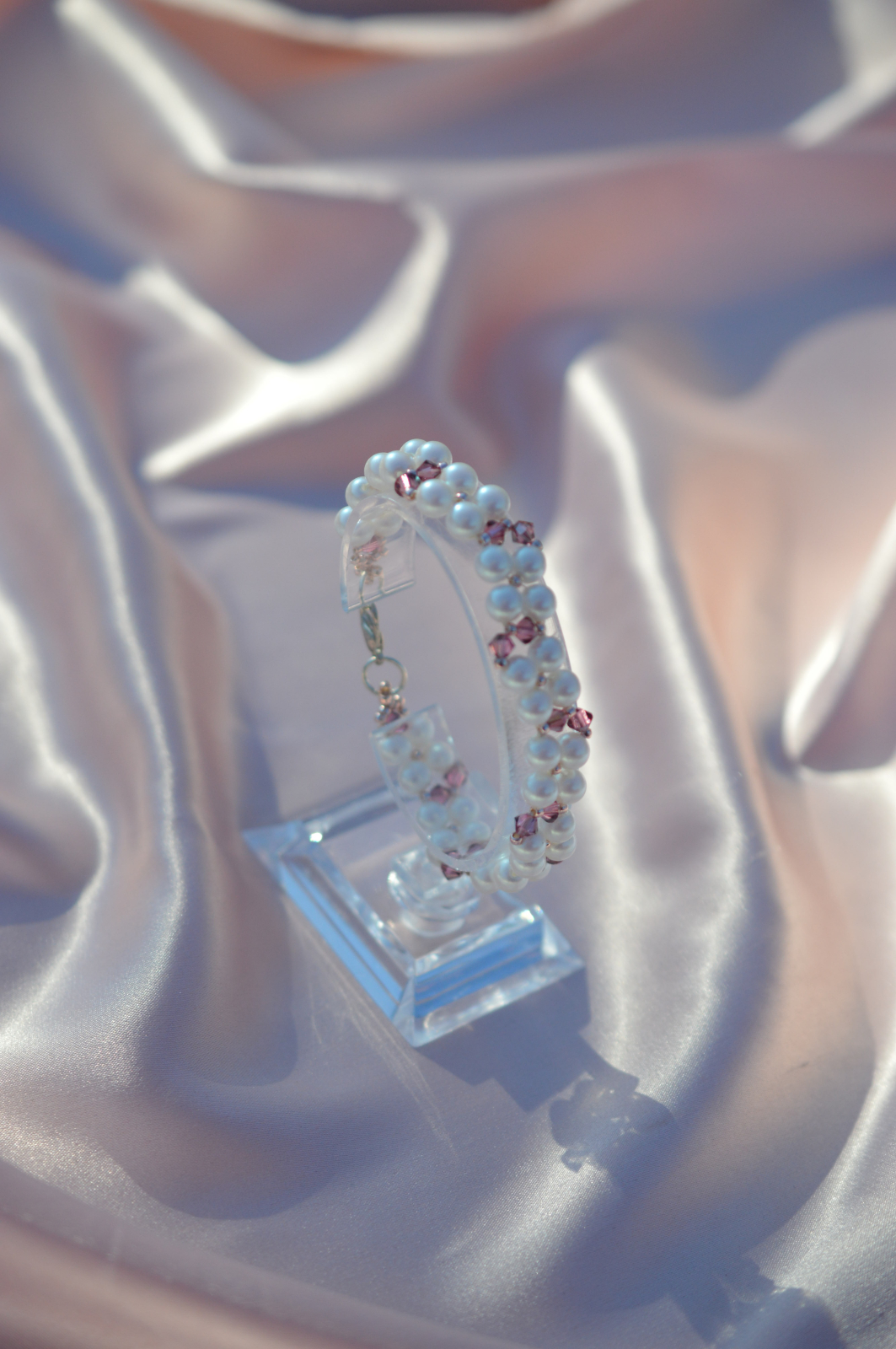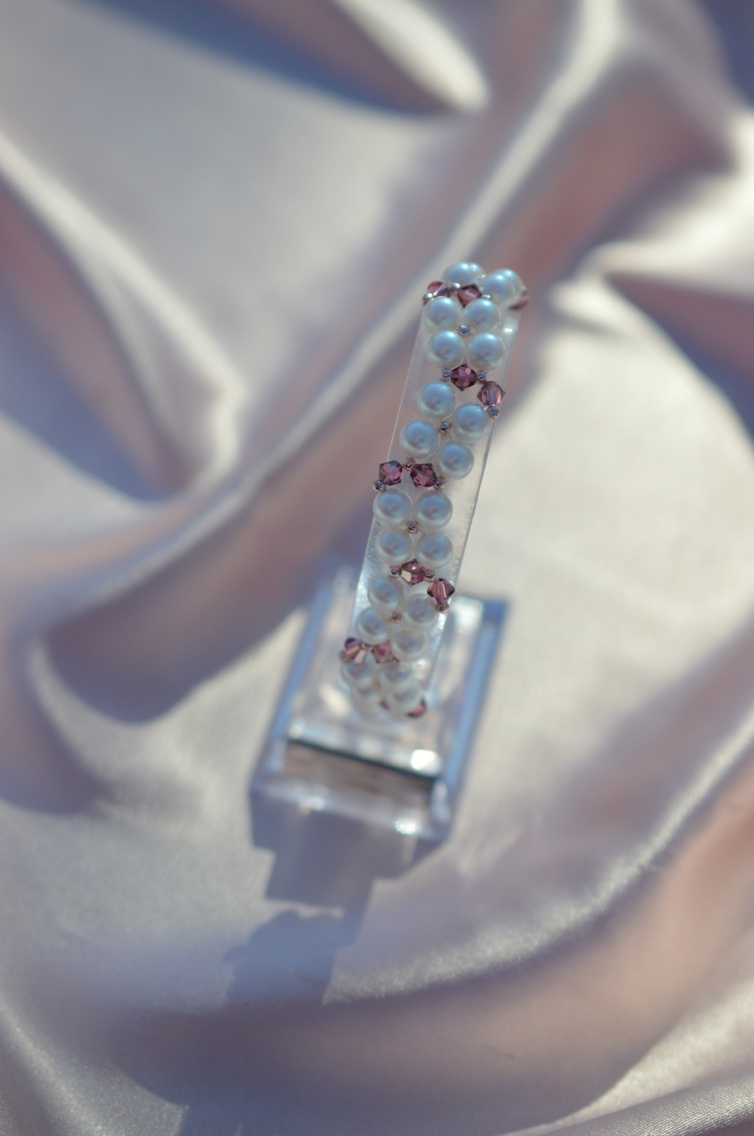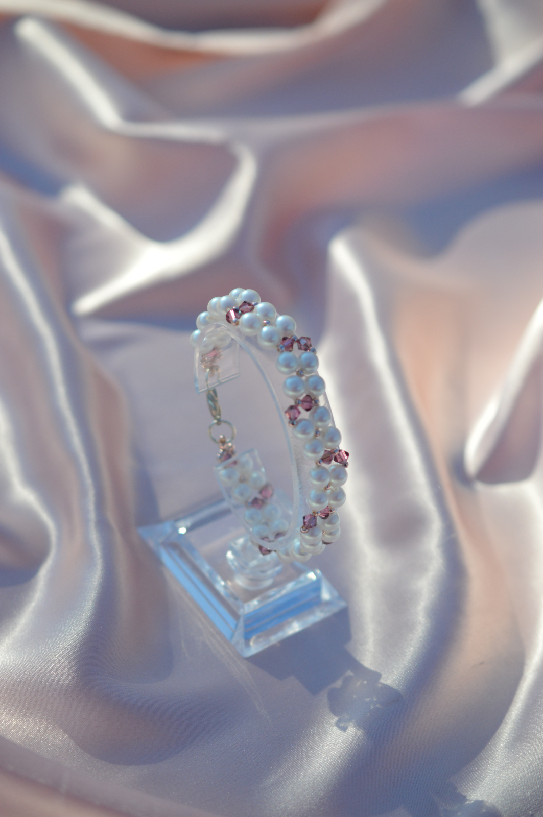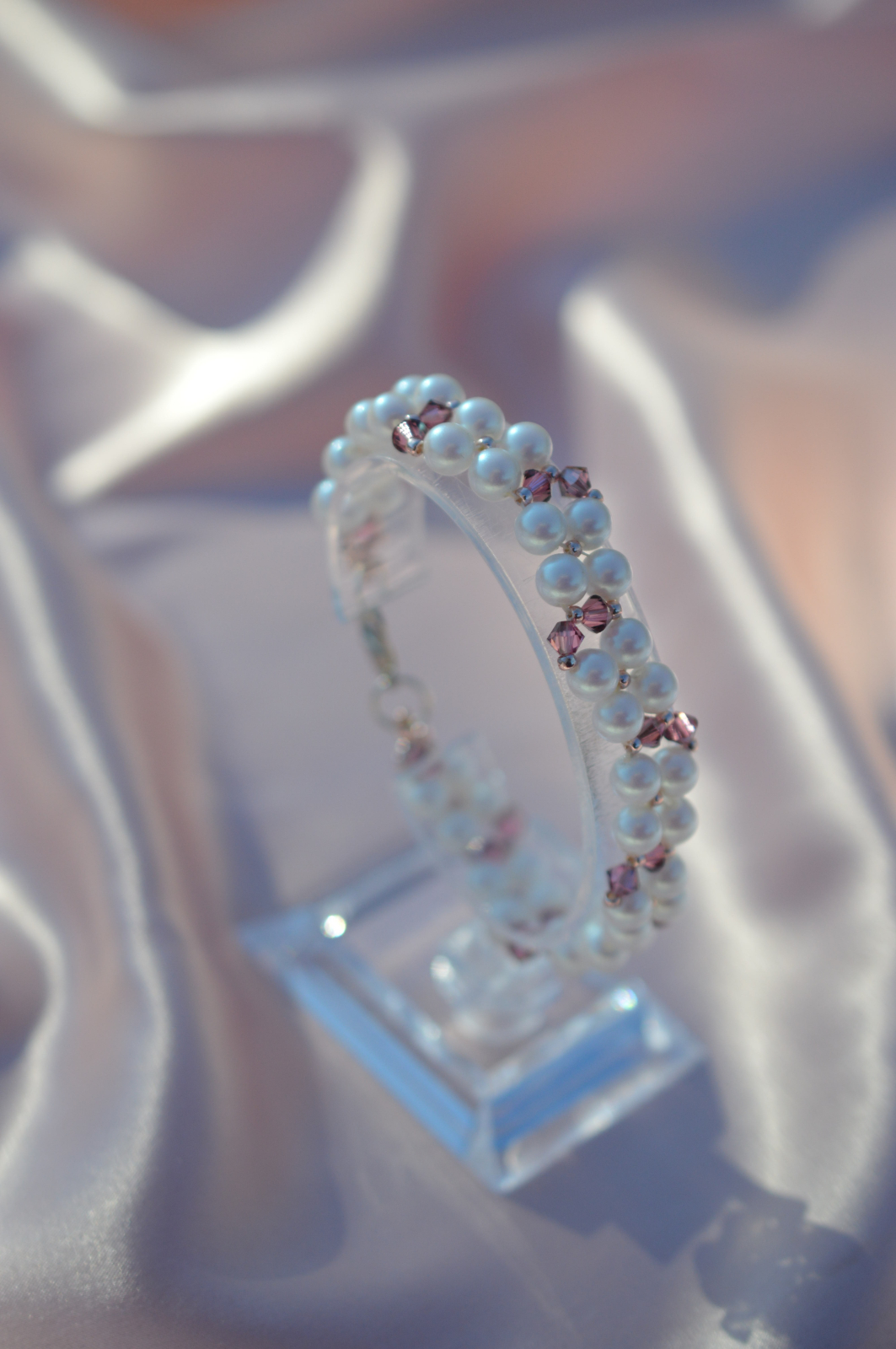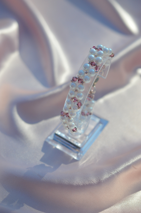Bratara realizata manual din perle Swarovski cu reflexii delicate roz si bleu, care isi schimba subtil nuanta in functie de lumina si unghiul privirii. Designul este completat de cristale Swarovski mov, care adauga contrast si stralucire compozitiei. Alternanta dintre perlele luminoase si cristalele facetate creeaza un ritm vizual elegant si echilibrat, oferind bratarii un aspect rafinat si feminin. Tonurile perlate si accentele mov transforma piesa intr-o bijuterie delicata, potrivita atat pentru tinute elegante, cat si pentru ocazii speciale. Latimea de aproximativ 1.4 cm pastreaza designul fin si confortabil la purtare, mentinand in acelasi timp prezenta vizuala a bratarii. Lungimea standard este de 19 cm, iar modelul poate fi realizat la comanda pe orice dimensiune pentru o potrivire perfecta. Inchizatorile din otel inoxidabil ofera rezistenta si siguranta la purtare.