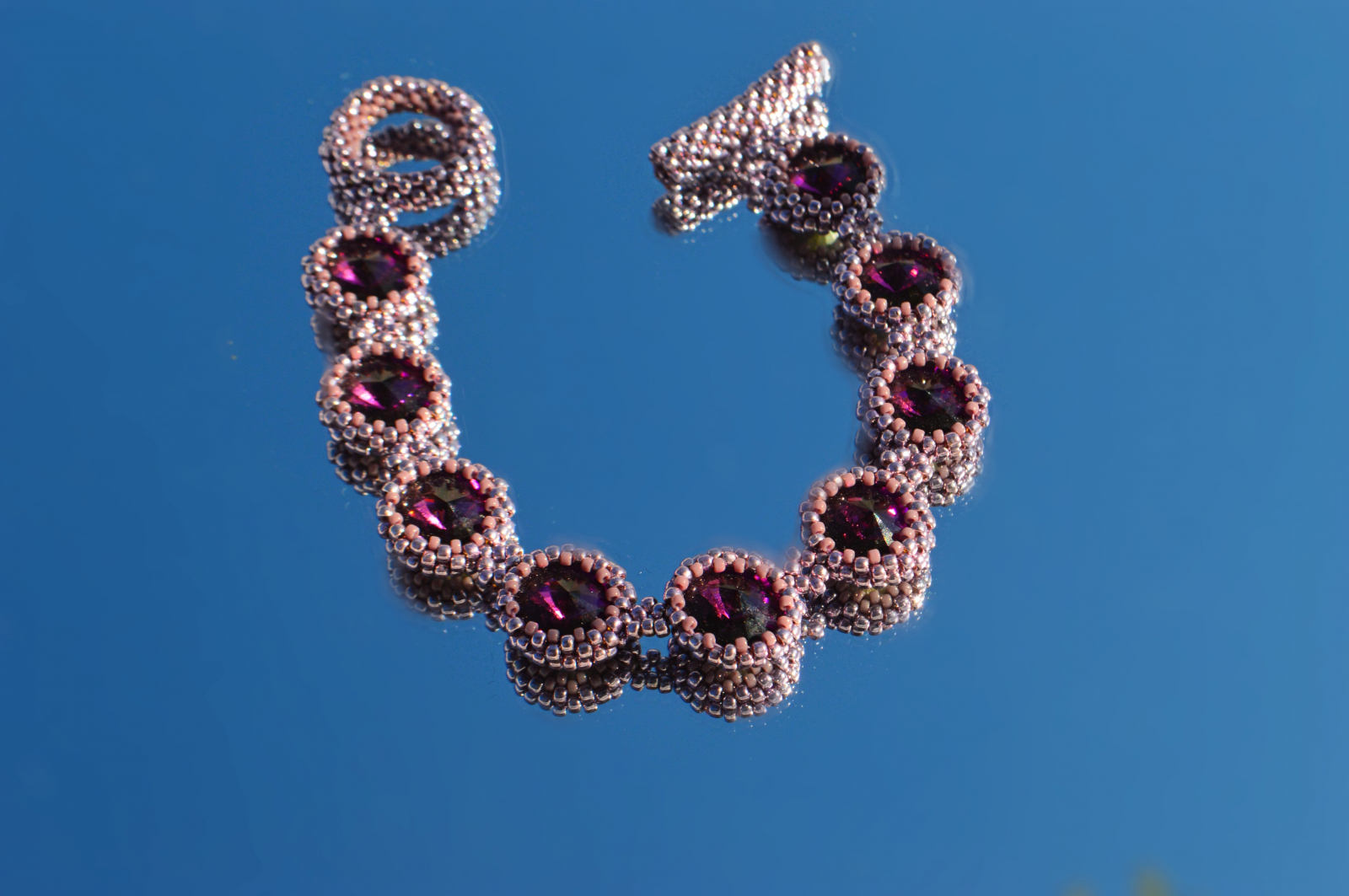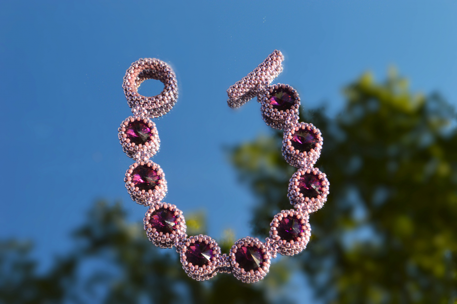 Bratara realizata manual, construita din cristale Swarovski in nuanta ametist montate individual in rame cusute din margele fine Toho. Fiecare element este prins separat, ceea ce ii ofera flexibilitate, rezistenta si un aspect bine definit pe mana.