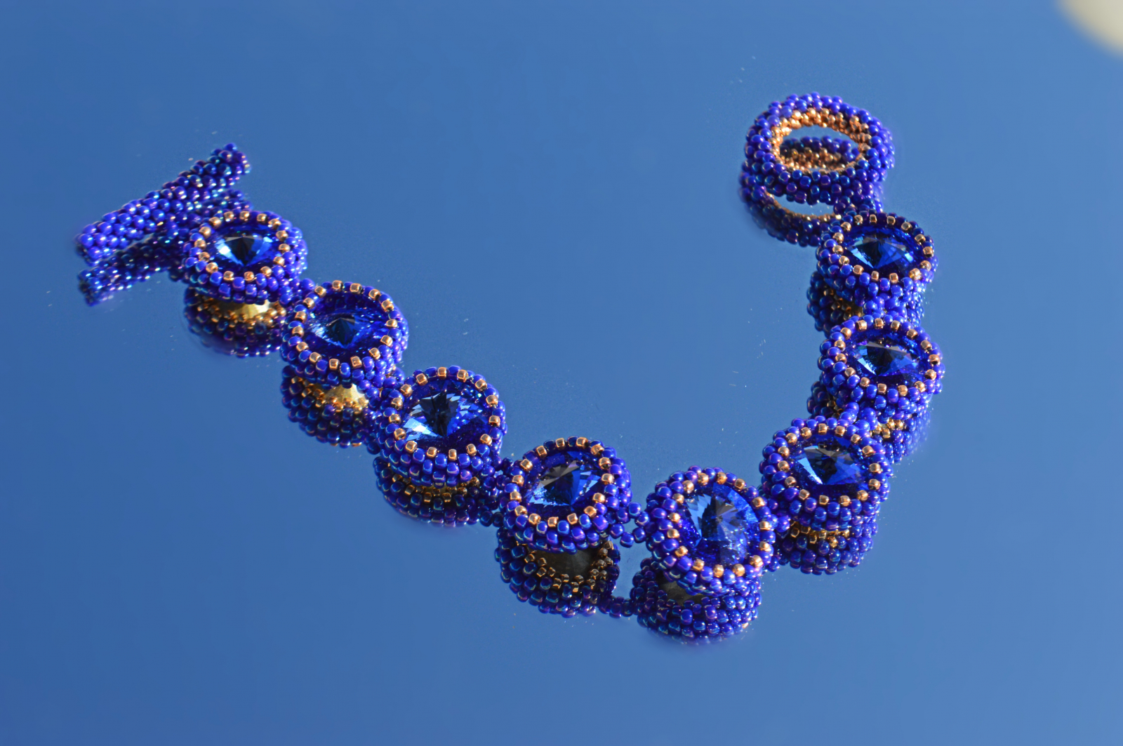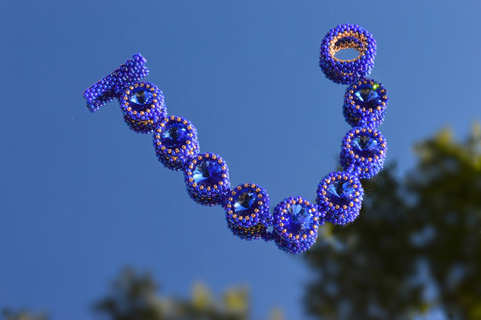 Bratara realizata manual, compusa din cristale Swarovski navy blue montate individual in rame cusute din margele fine Toho. Fiecare element este prins separat, ceea ce ii ofera flexibilitate, rezistenta si o asezare fluida pe incheietura.