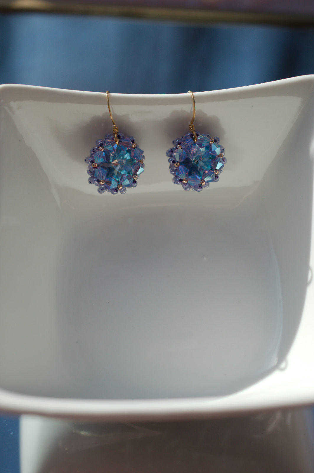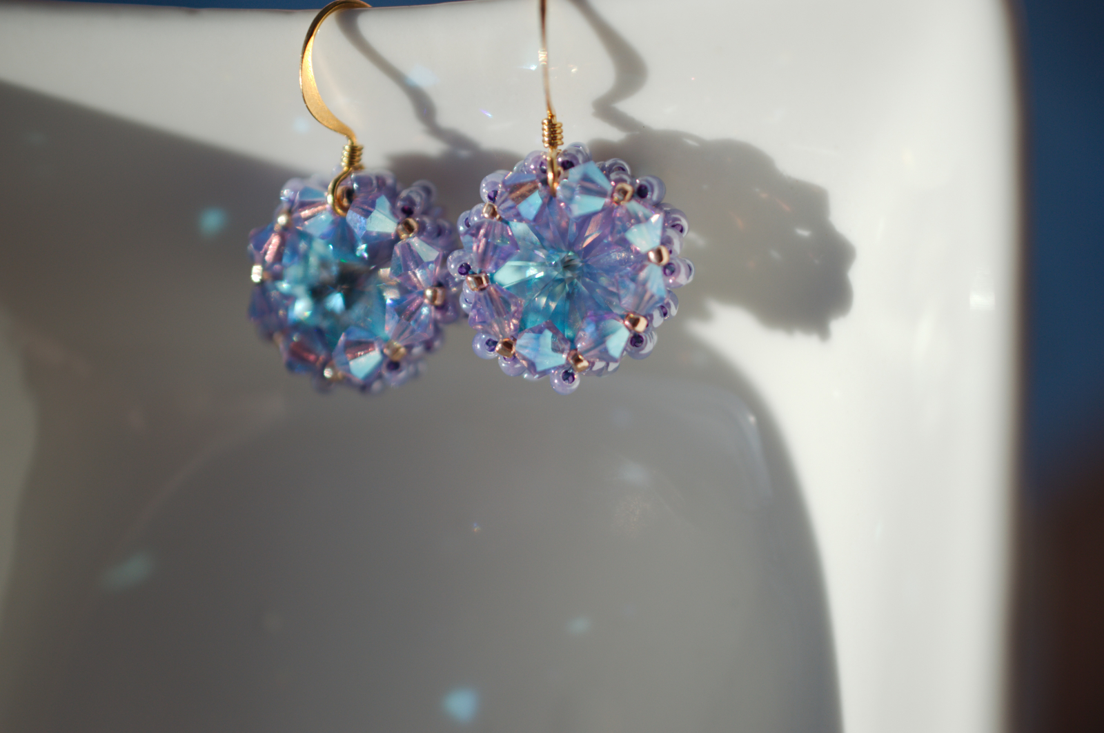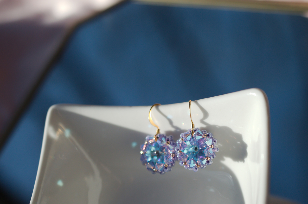 Adauga un plus de magie tinutei tale cu acesti cercei stralucitori, realizati manual cu cristale Swarovski cu reflexii albastru-mov. In functie de lumina, nuantele lor se transforma spectaculos, oferindu-ti un look sofisticat si plin de farmec.