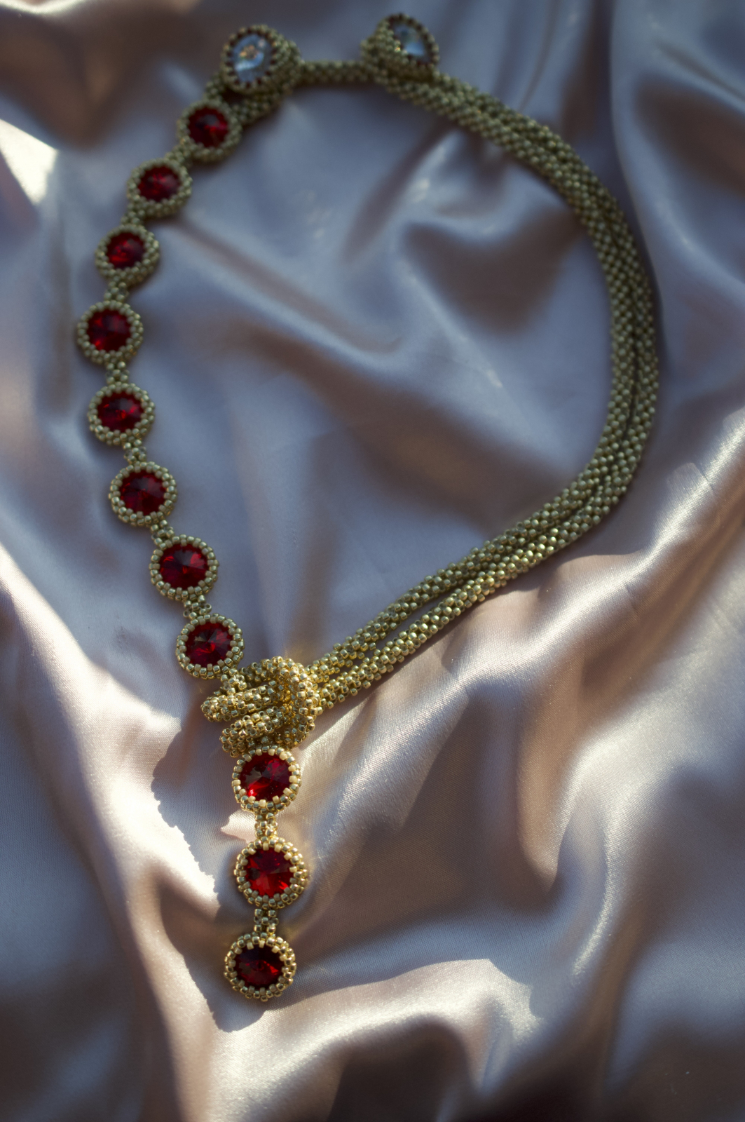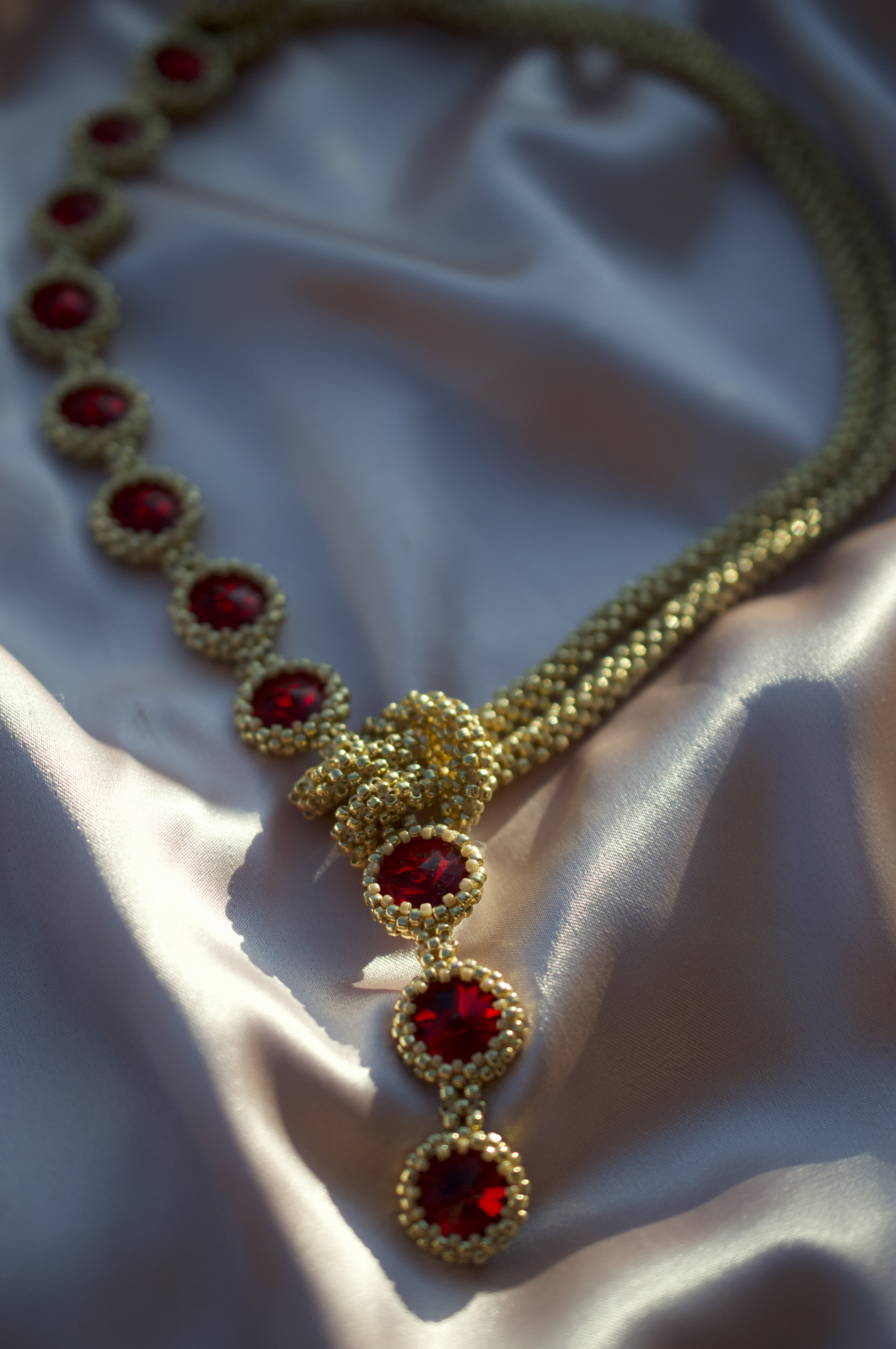 Transforma orice aparitie intr-un moment memorabil cu acest colier spectaculos, realizat manual cu migala si atentie la detalii. Designul clasic cu aer regal evidentiaza cristalele Swarovski in nuante de rosu, montate cu precizie si incadrate in margelute Toho aurii pentru un efect luxuriant si stralucitor.