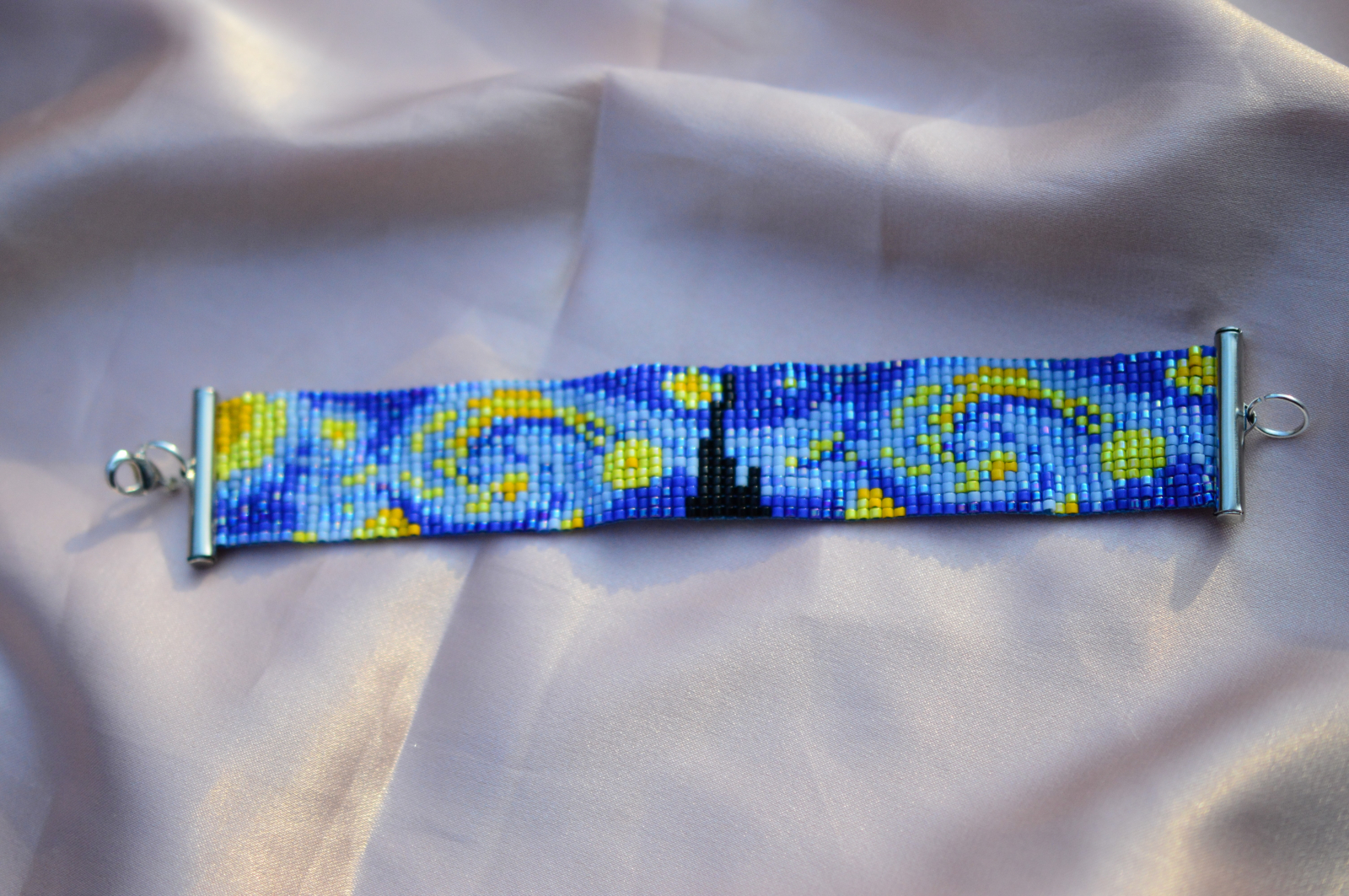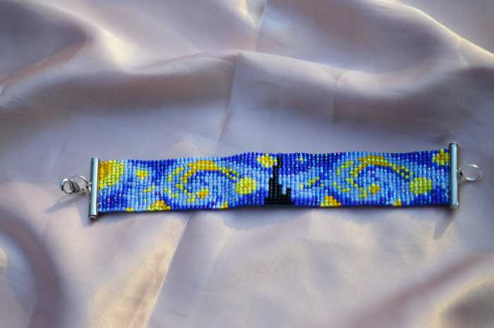 Aceasta bratara handmade este inspirata de capodopera lui van Gogh, "Noaptea Instelata". Designul delicat si culorile vibrante transforma aceasta bijuterie intr-un accesoriu de arta purtabil.