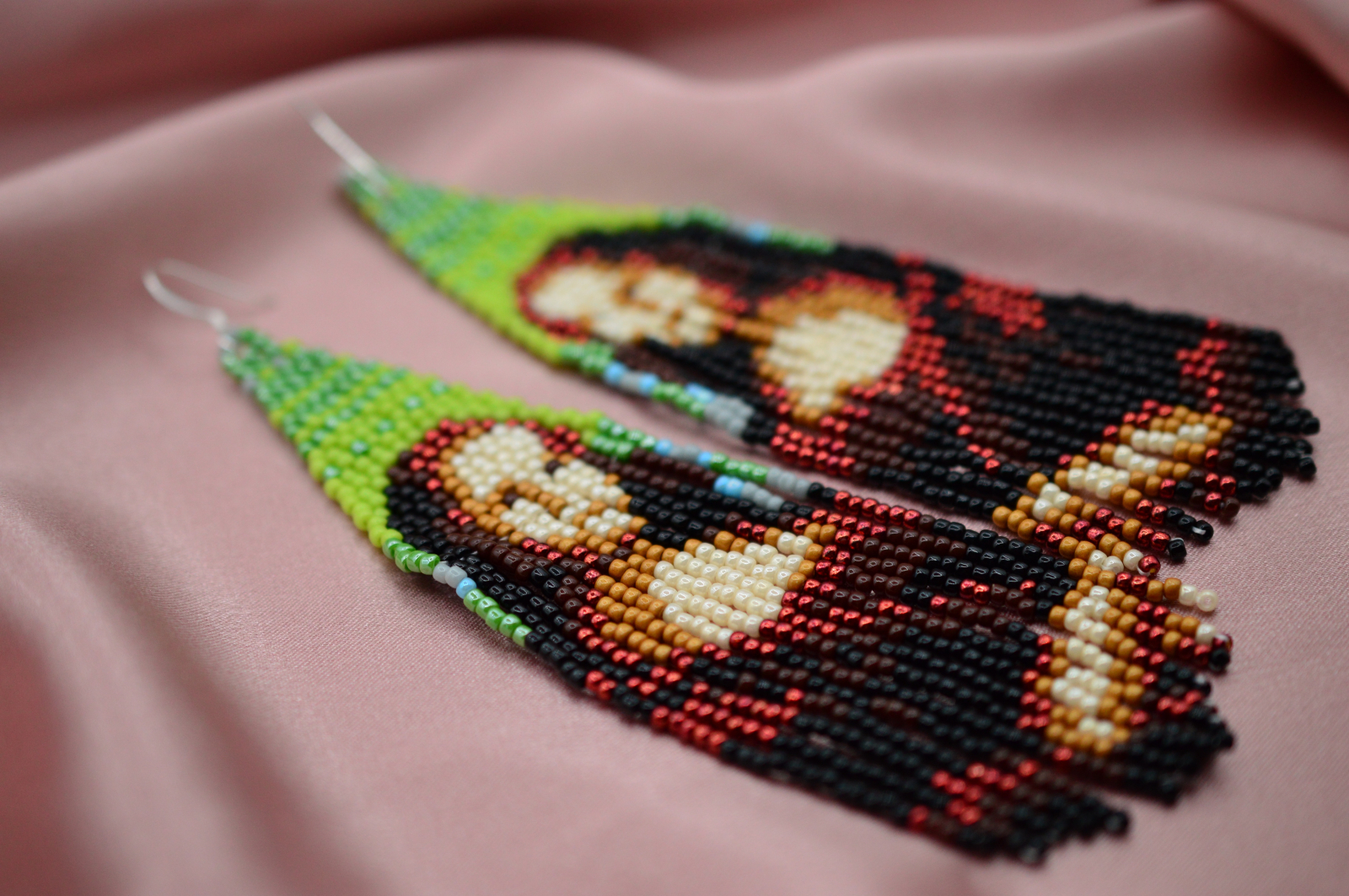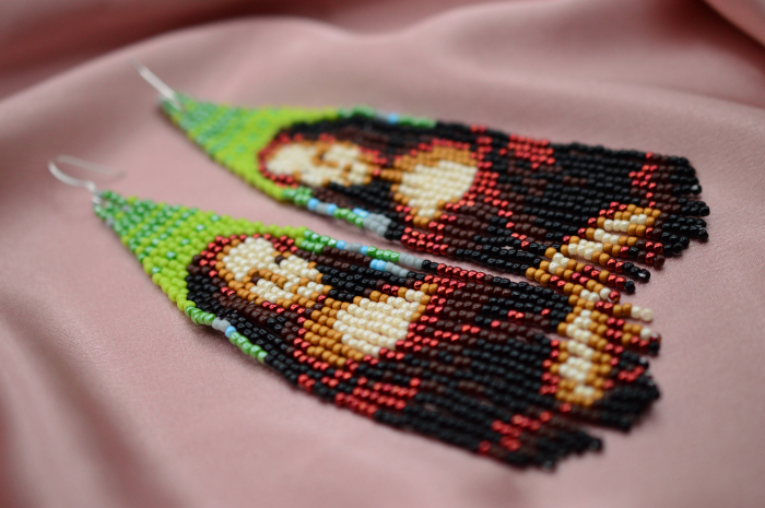 Cercei statement realizati manual, inspirati de celebra pictura „Mona Lisa” a lui Leonardo da Vinci. Designul reda portretul iconic in tonuri profunde de maro, verde si accente aurii, transformand fiecare pereche intr-o piesa care atrage imediat privirea.