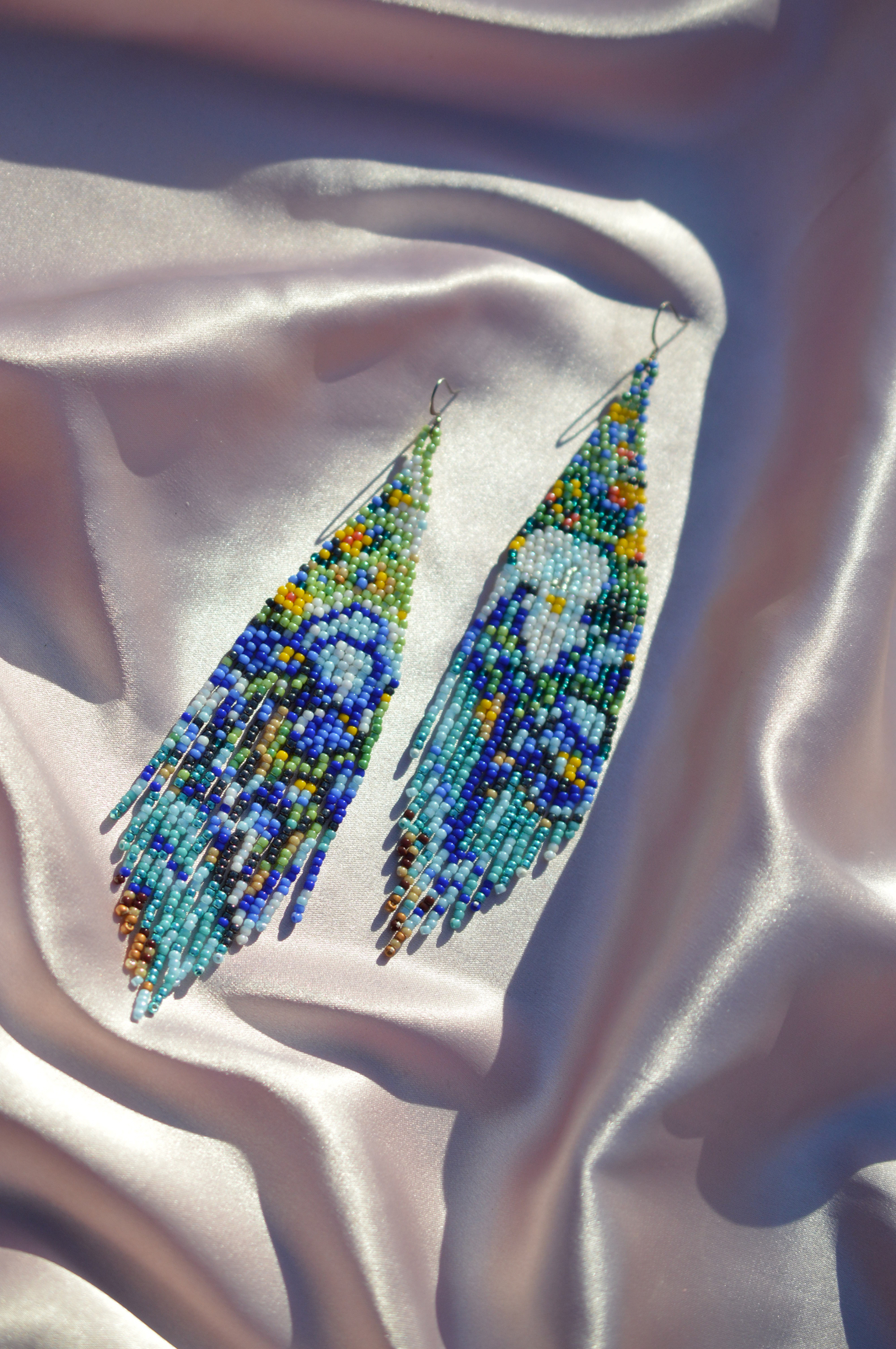 Inspirati de celebra pictura "Irises" a lui Vincent van Gogh, acesti cercei statement transpun in margele miscarea, lumina si intensitatea florilor albastre pictate la Saint-Remy.