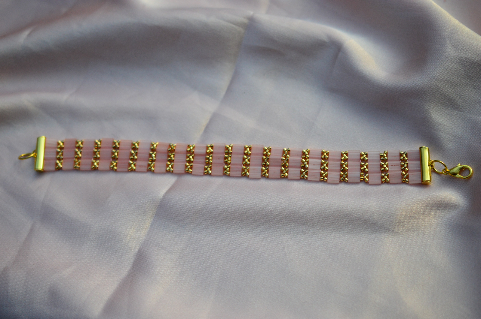 Delicata si stralucitoare, bratara Tila roz aduce un strop de feminitate rafinata in garderoba ta. Realizata manual cu margele japoneze Tila si Miyuki Delica placate cu aur, aceasta bijuterie impresioneaza prin combinatia armonioasa dintre rozul diafan si accentele aurii sofisticate.