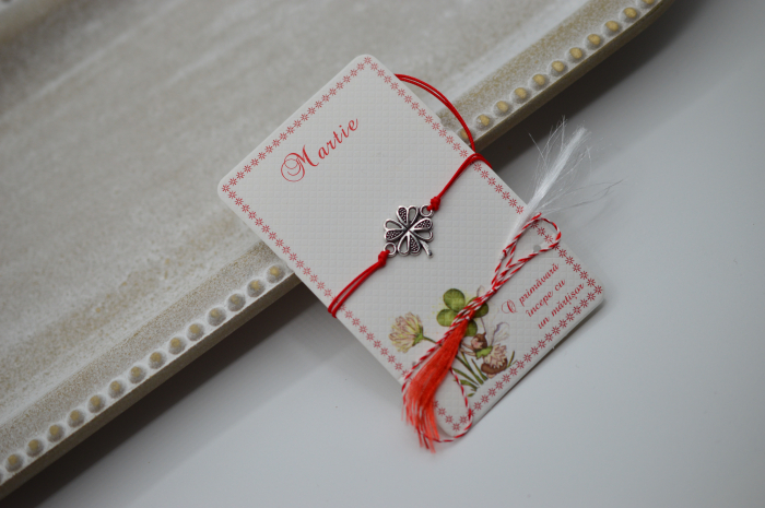 Fiecare bratara este insotita de carton traditional de martisor si snur rosu, impachetate intr-o punguta de plastic, gata pentru a fi oferite in dar.