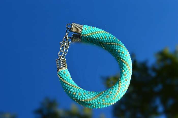 O bijuterie care aduce prospetimea verii pe incheietura ta. Aceasta bratara handmade este crosetata cu margele Toho in nuante de turcoaz si verde, creand un efect fluid, luminos si relaxant.