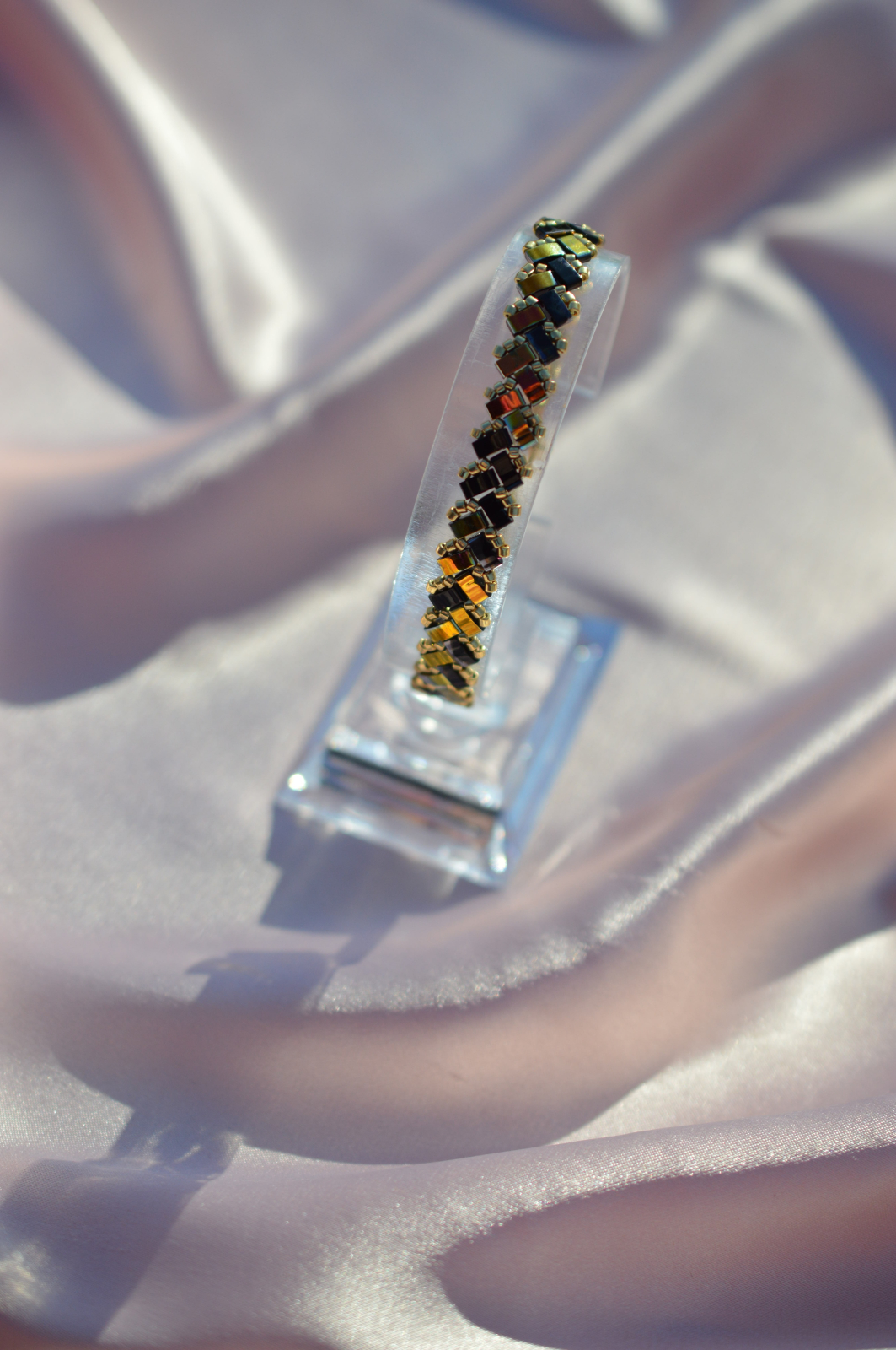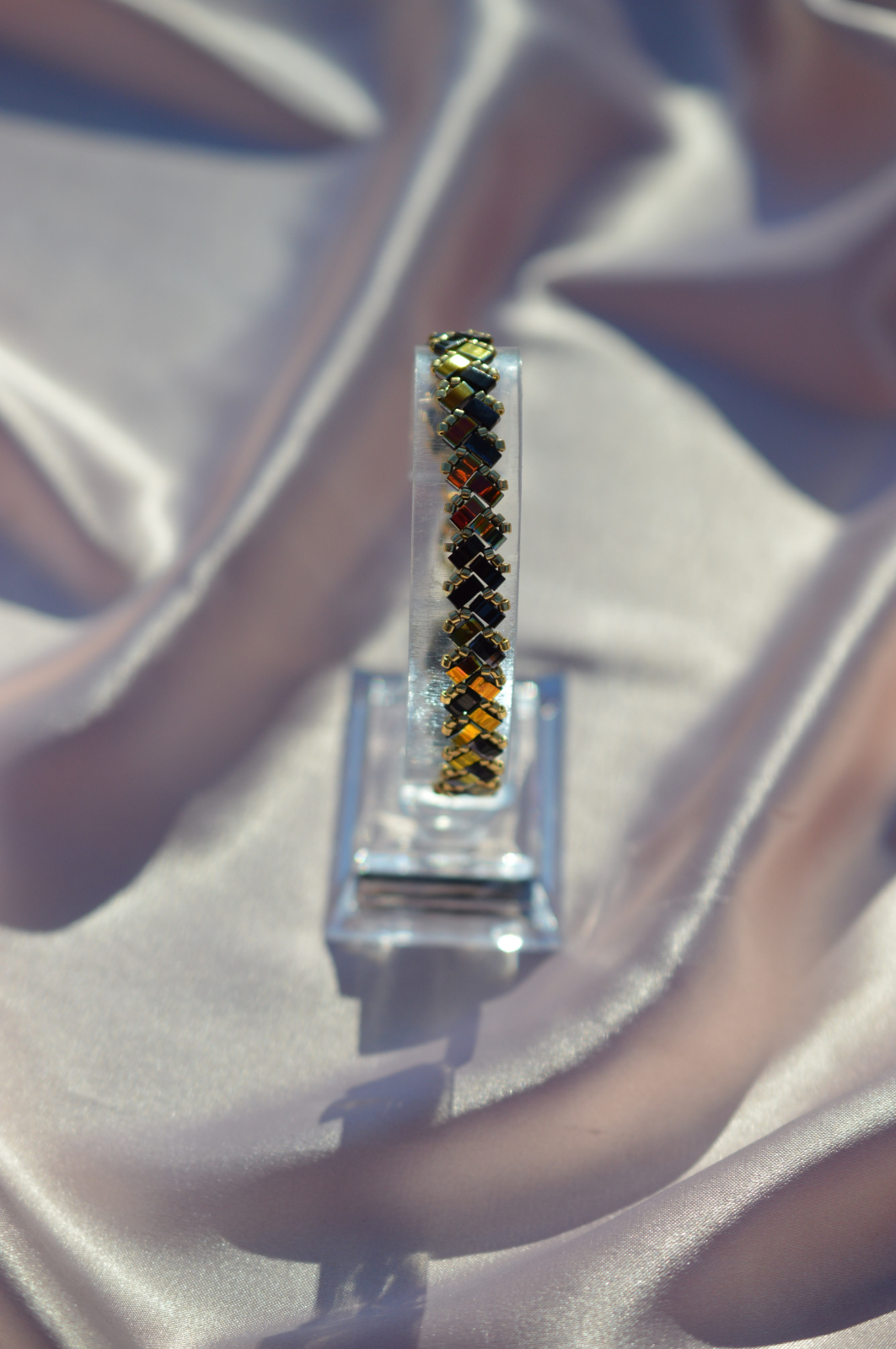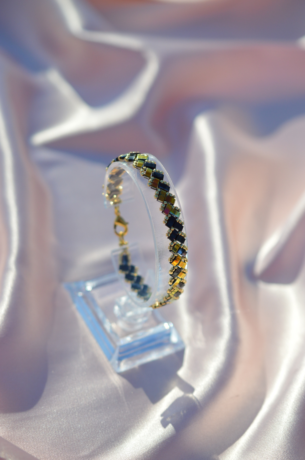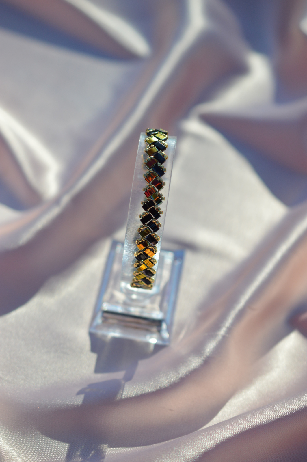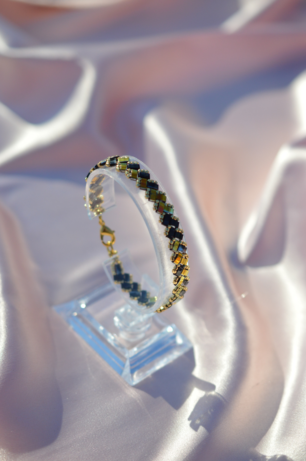 Bratara realizata manual din margele Half Tila in nuanta Black Marea, o combinatie eleganta de tonuri inchise cu reflexii irizate care variaza subtil intre negru, verde petrol si mov, in functie de lumina. Forma plata a margelelor creeaza un model geometric compact si ordonat, oferind bratarii un aspect modern si rafinat. Accentele realizate cu margele Delica placate cu aur contureaza discret designul si adauga luminozitate piesei. Contrastul dintre tonurile profunde si detaliile aurii transforma bratara intr-o bijuterie sofisticata, potrivita atat pentru tinute elegante, cat si pentru combinatii moderne de zi. Latimea de aproximativ 1 cm pastreaza linia fina si confortabila a bratarii. Lungimea standard este de 17 cm, iar modelul poate fi realizat la comanda pe orice dimensiune pentru o potrivire perfecta. Inchizatorile din otel inoxidabil asigura rezistenta si durabilitate in timp.