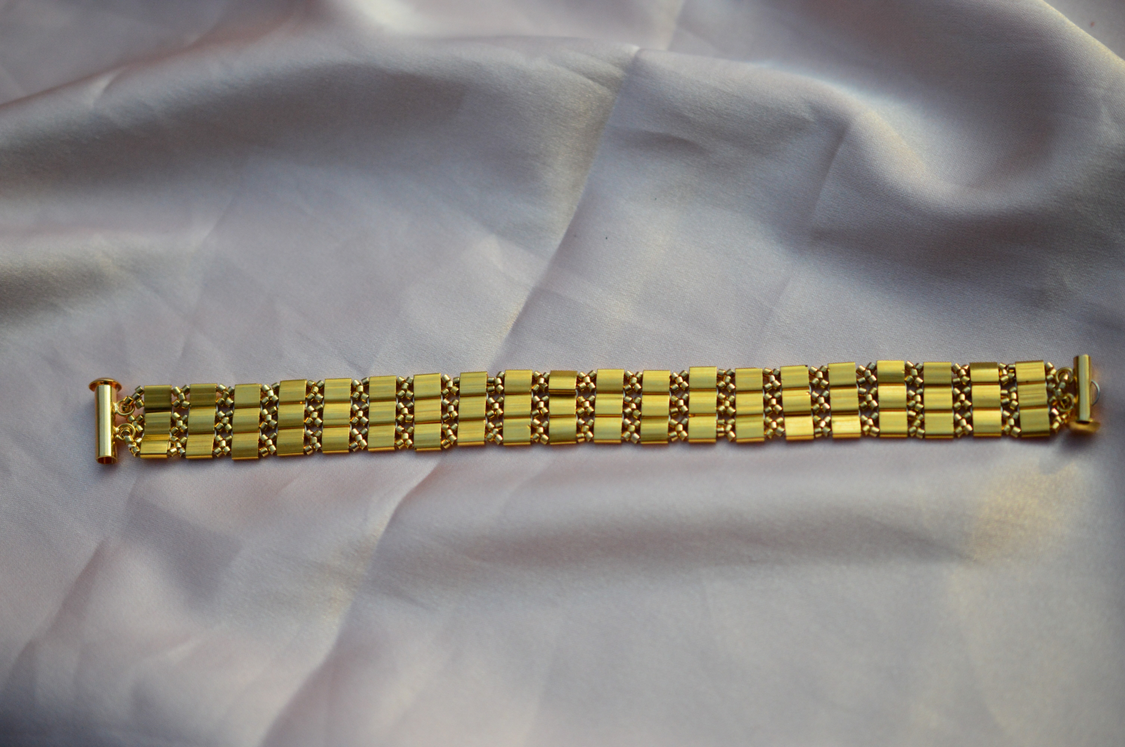 Materiale: Margele Tila placate cu aur, margele miyuki delica placate cu aur si inchisatori toggle placate cu aur
