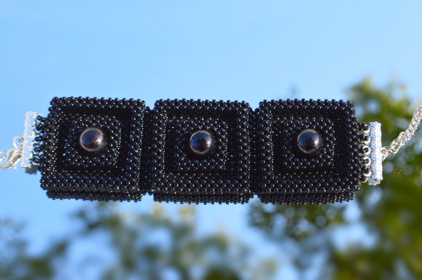 Bratara statement realizata manual din margele Toho, cu design geometric in relief si contrast puternic de culoare. Un accesoriu vizibil, creat pentru tinute care au nevoie de un punct de atractie clar.