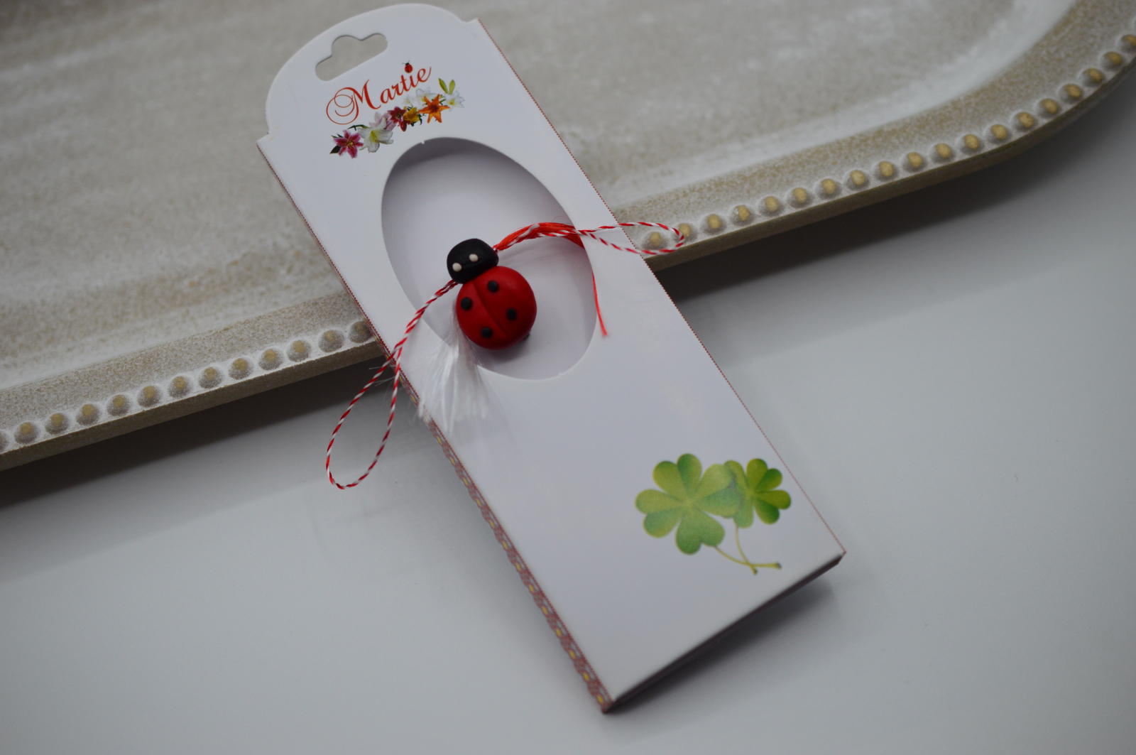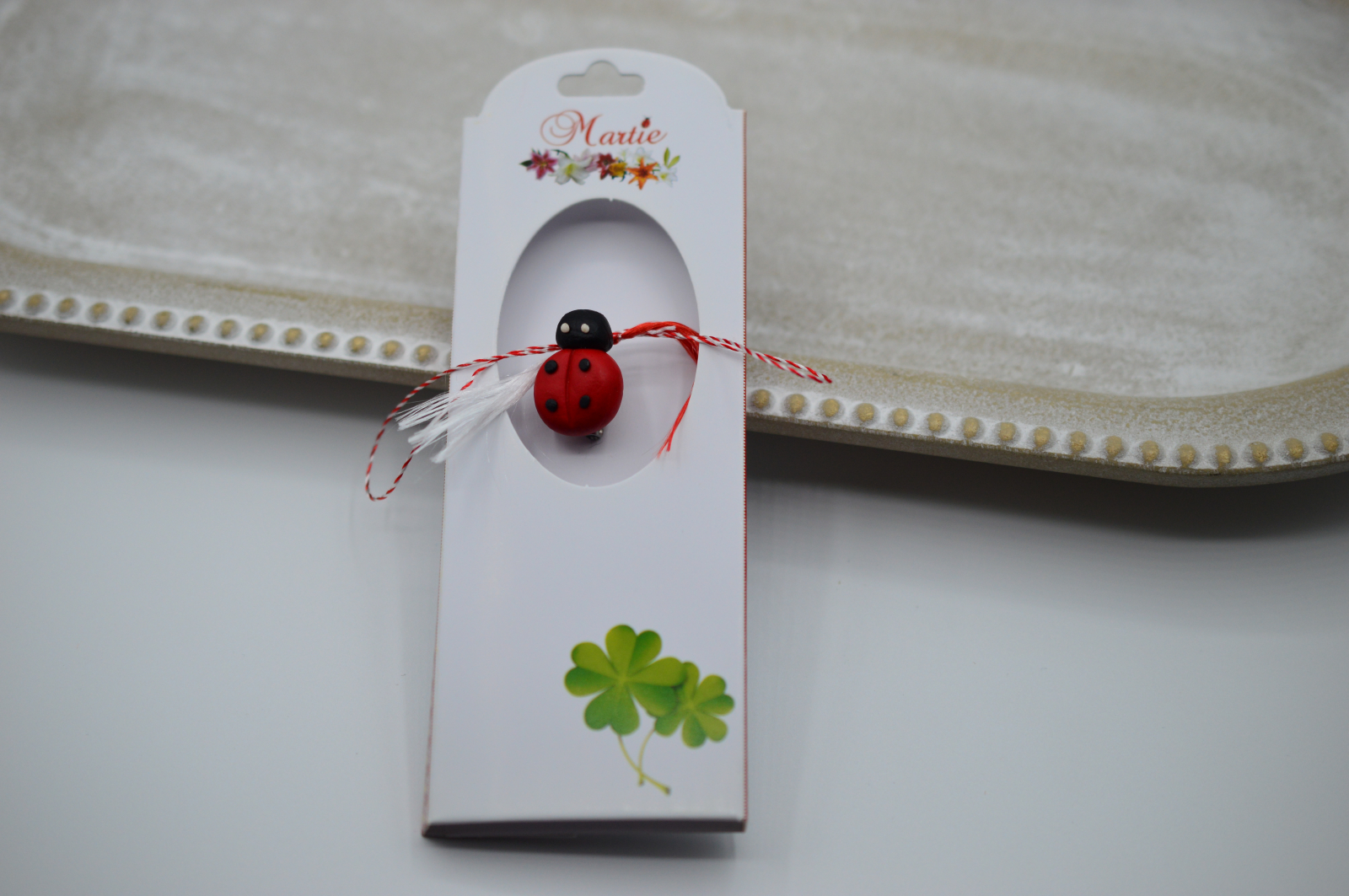 Brosa vine pe un carton cu snurul clasic de martisor.