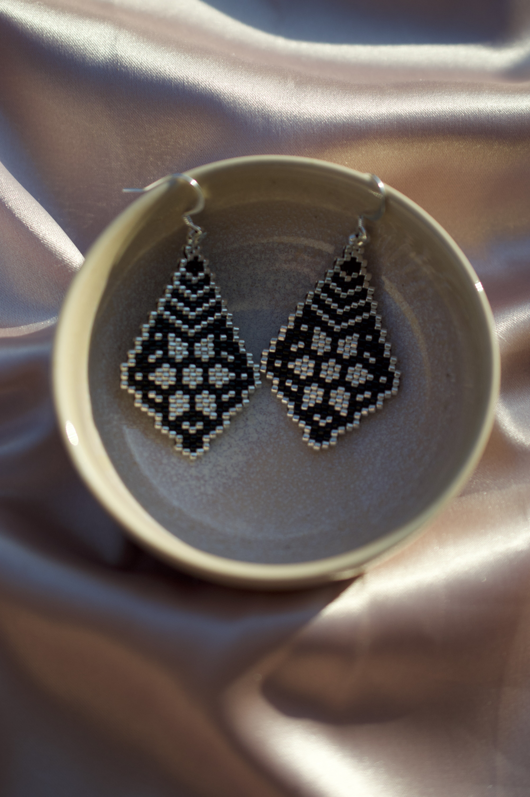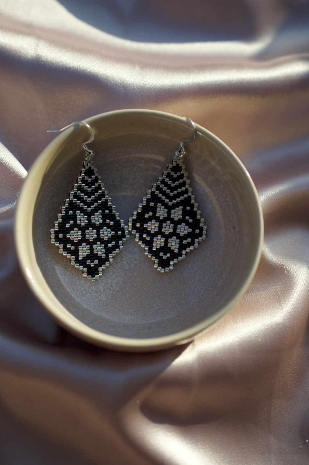 Cerceii "Astra" combina rafinamentul margelelor placate cu argint cu un design geometric inspirat de motive traditionale. Modelul lor in forma de romb, cu accente florale si un contrast elegant argintiu-negru, aduce un plus de stil si mister oricarei tinute. Fiecare pereche este realizata manual cu migala, fiind prevazuta cu tortite placate cu argint.