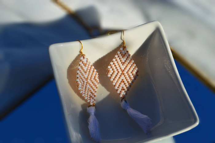 Cerceii Audrey sunt realizati manual din margele Toho, intr-un model geometric cu linii fluide care alungesc vizual silueta si adauga eleganta miscarii. Tonurile calde si structura aerata ii fac usor de purtat atat ziua, cat si seara, cand lumina pune in valoare fiecare detaliu.