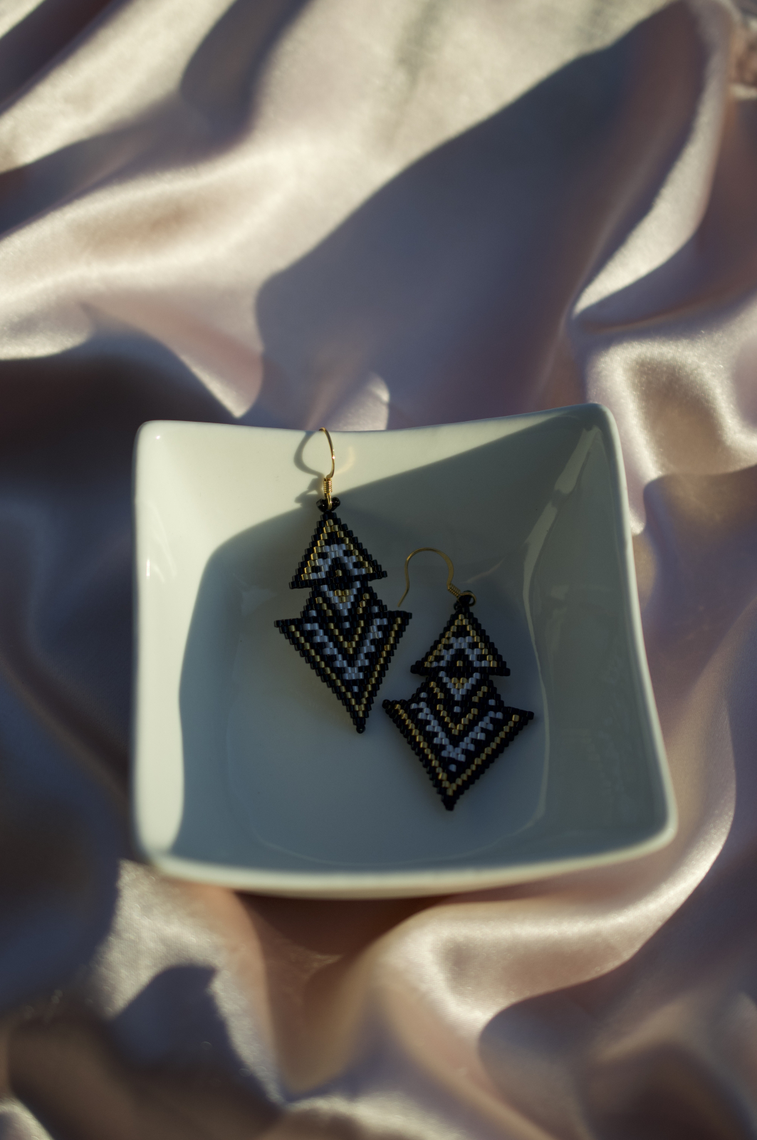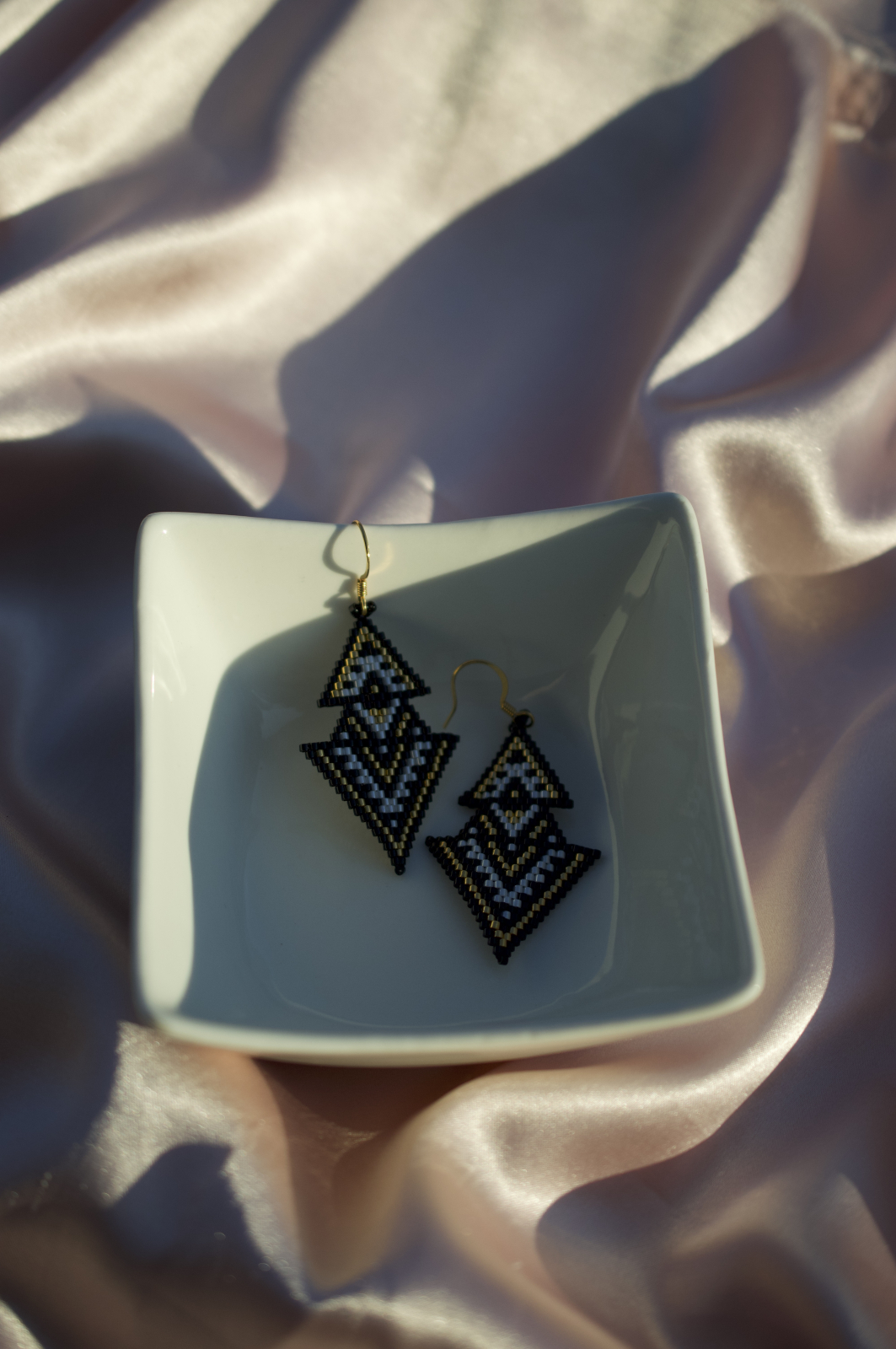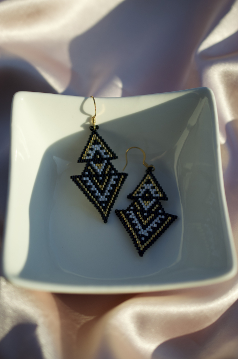 Descopera eleganta indrazneata a cerceilor Aurea, creati manual cu margele Delica placate cu aur si tortite placate cu aur pentru un plus de rafinament. Designul geometric, cu linii clare si contrast alb-negru accentuat de detalii aurii, transforma acesti cercei intr-un accesoriu statement ce atrage privirile la orice tinuta.