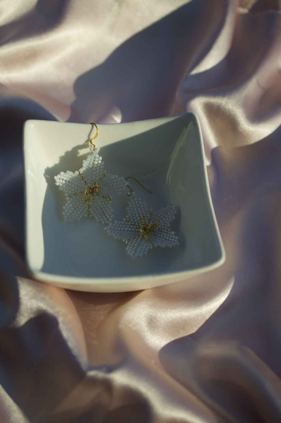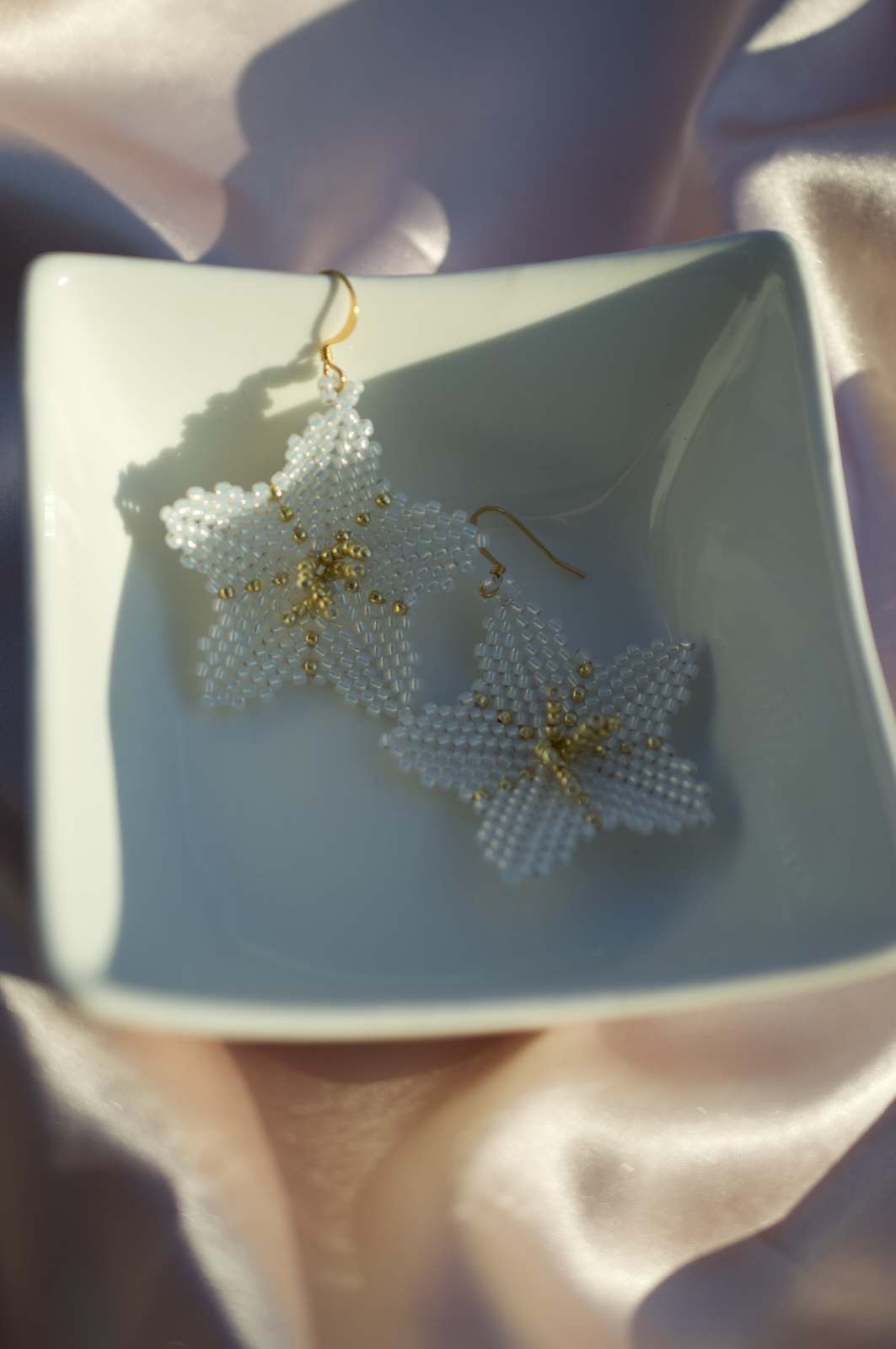 Ca o floare inflorita la rasarit, cerceii Camellia surprind esenta unui moment delicat, suspendat în timp. Margelutele alb laptos, aranjate cu precizie in forma unei flori de vis, reflecta lumina cu o stralucire blanda si sidefie – asemenea petalelor atinse de roua diminetii.