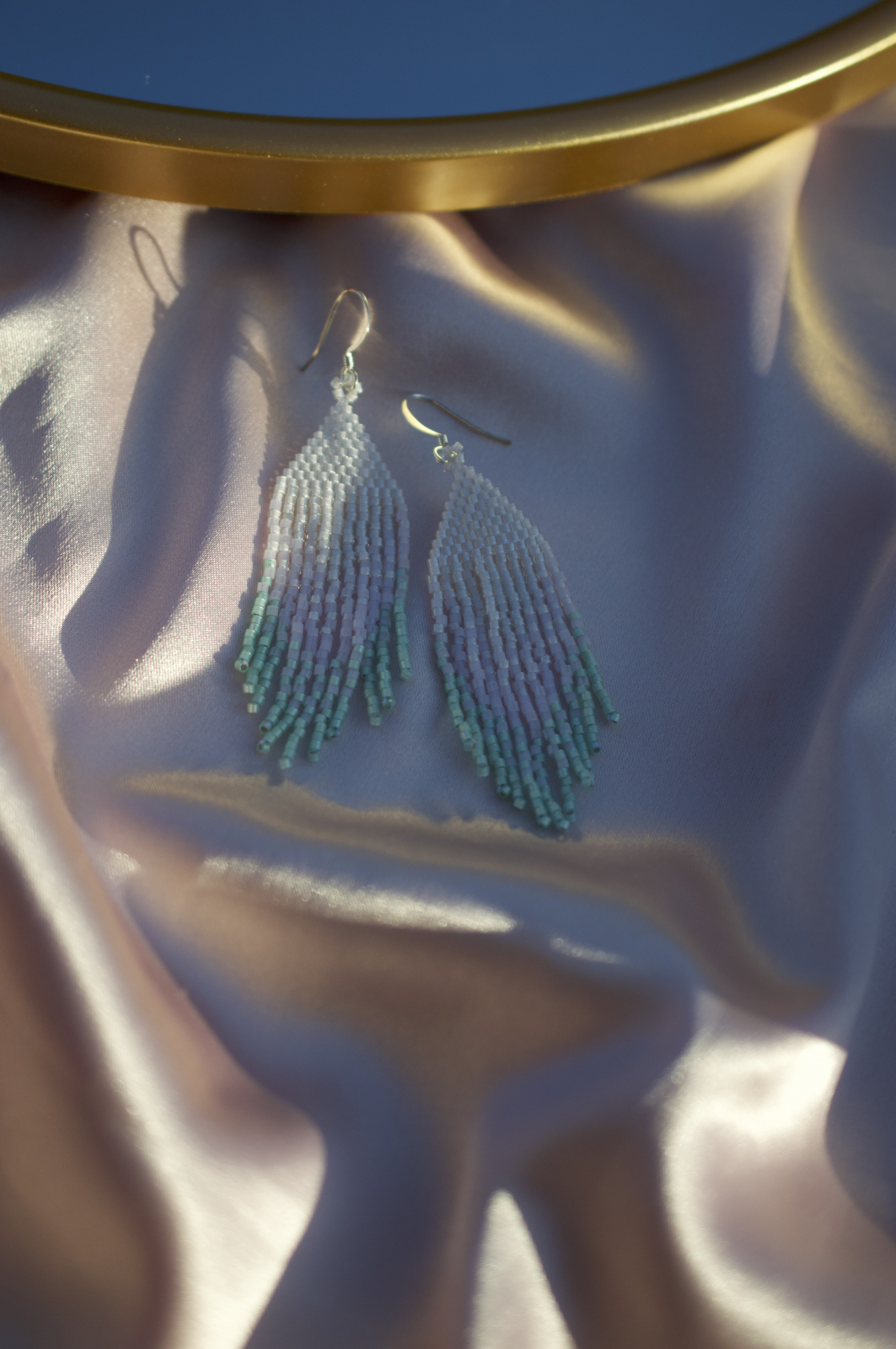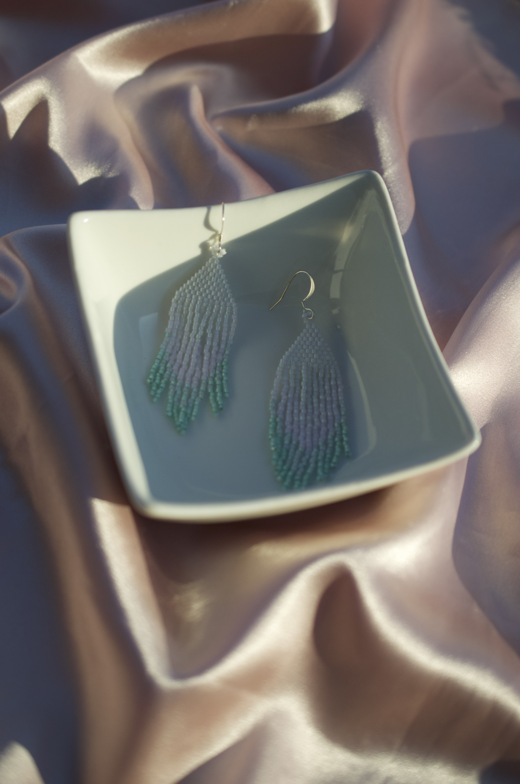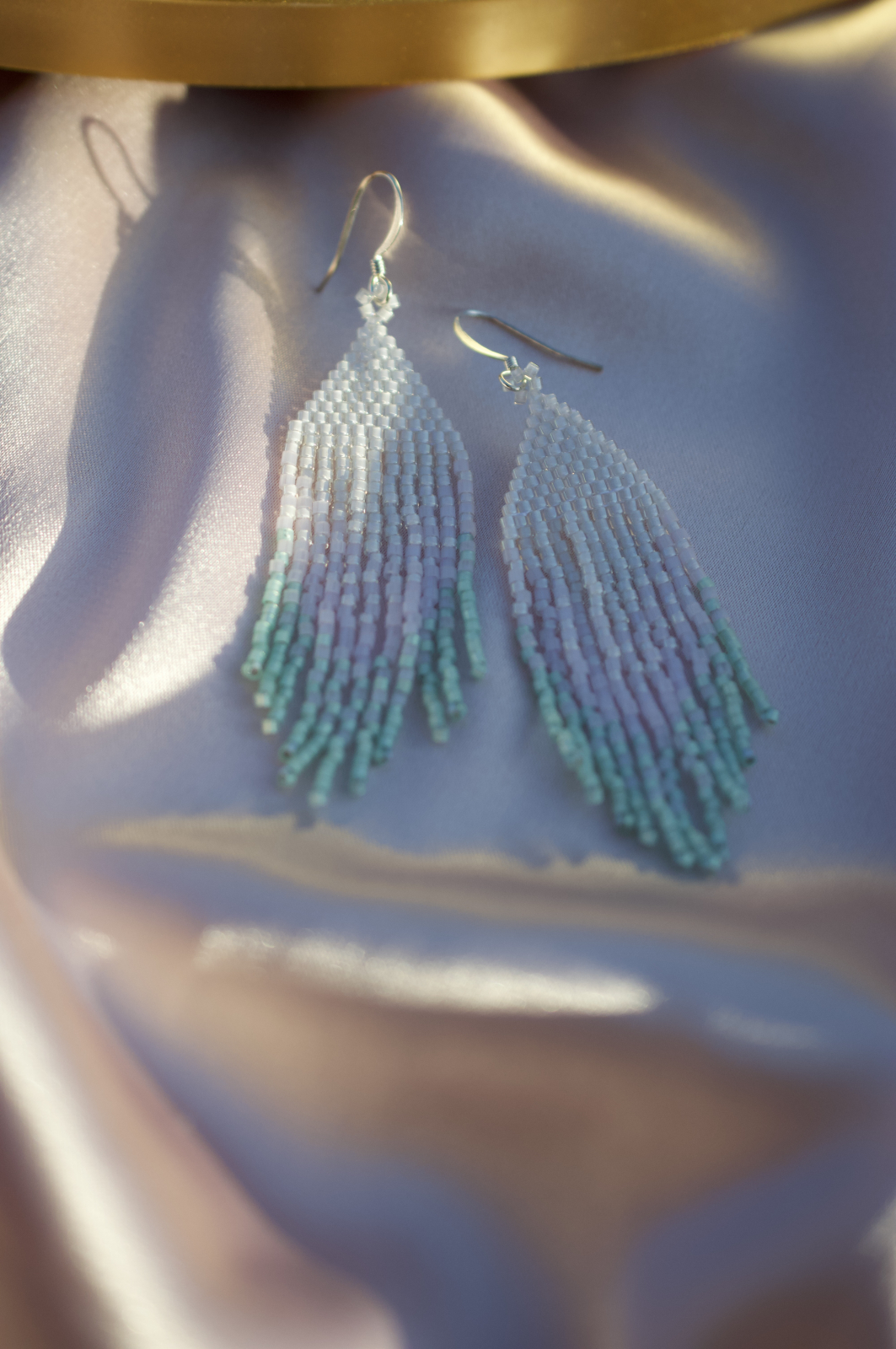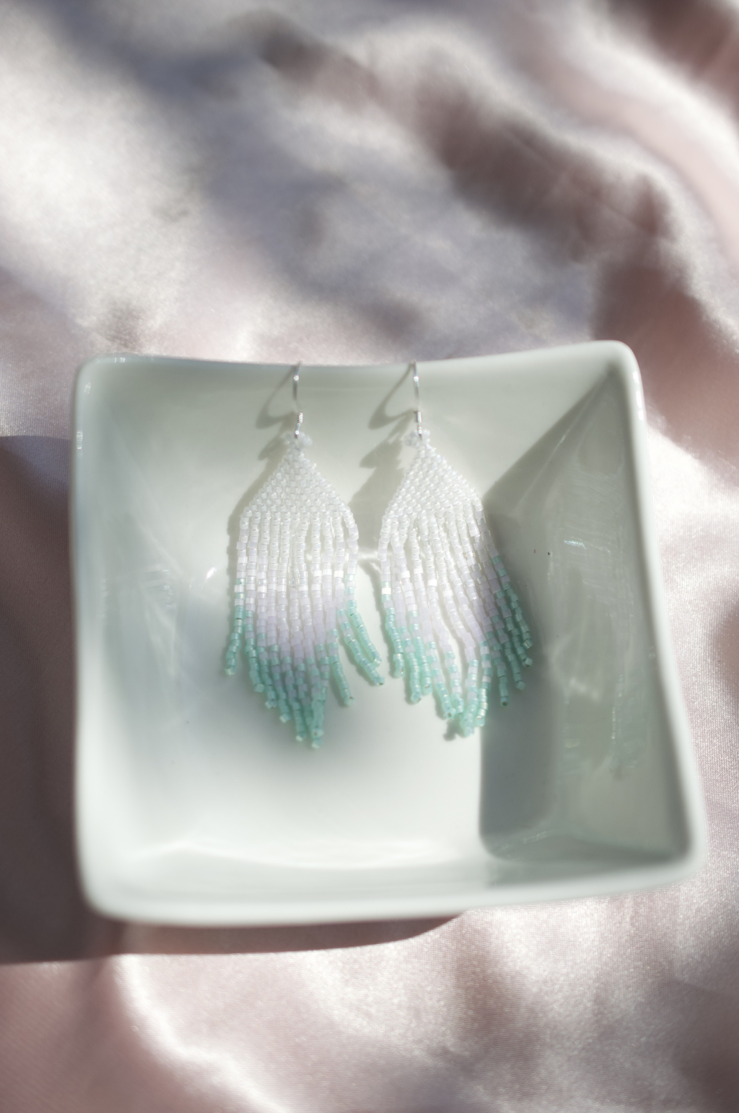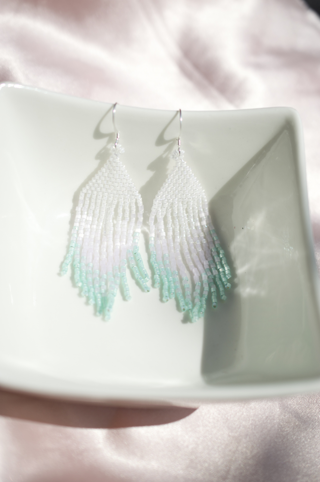 Cercei delicati realizati manual cu margele Miyuki Delica, in nuante de alb si turcoaz. Cu tortite placate cu argint si un design fluid inspirat de valuri, Clio adauga un strop de eleganta oricarei tinute.