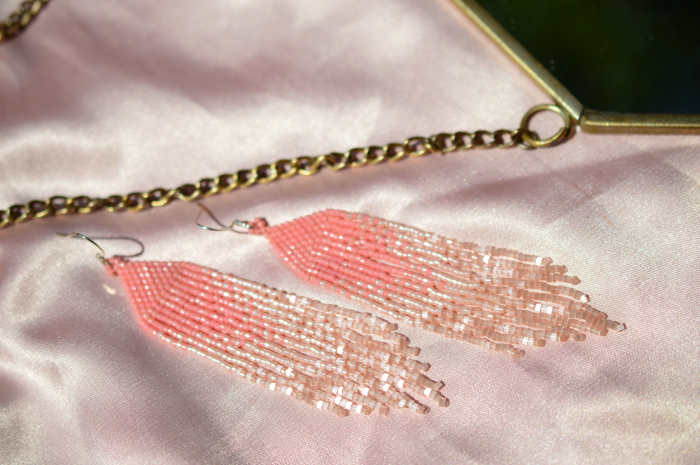 Cercei realizati manual din margele Miyuki Delica, cu textura fina si fluida. Nuanta roz pal, cu efect satinat, ofera un aspect delicat, feminin si usor romantic, fara sa fie obositor vizual.