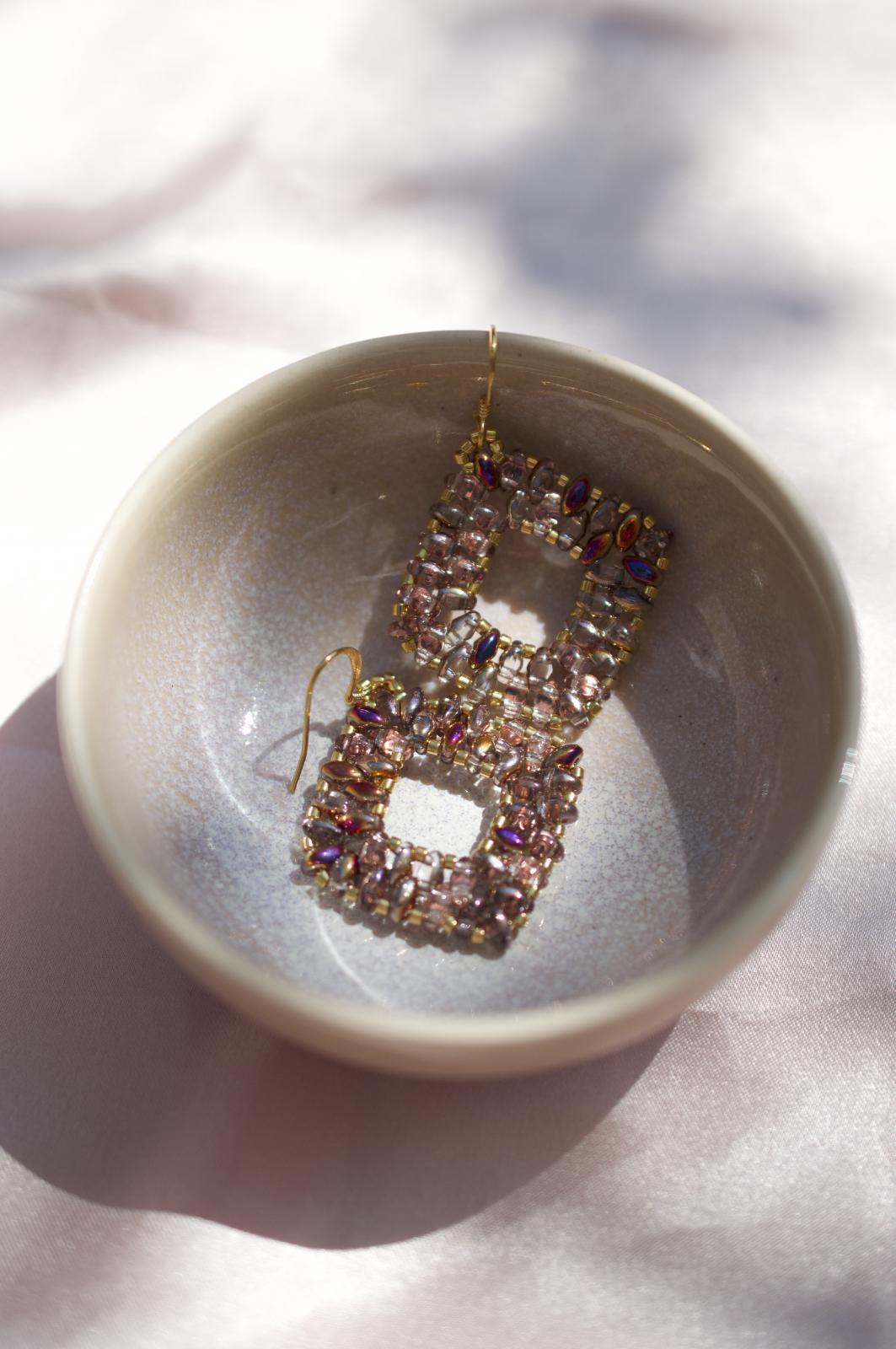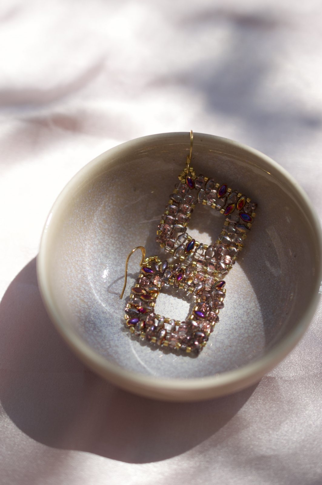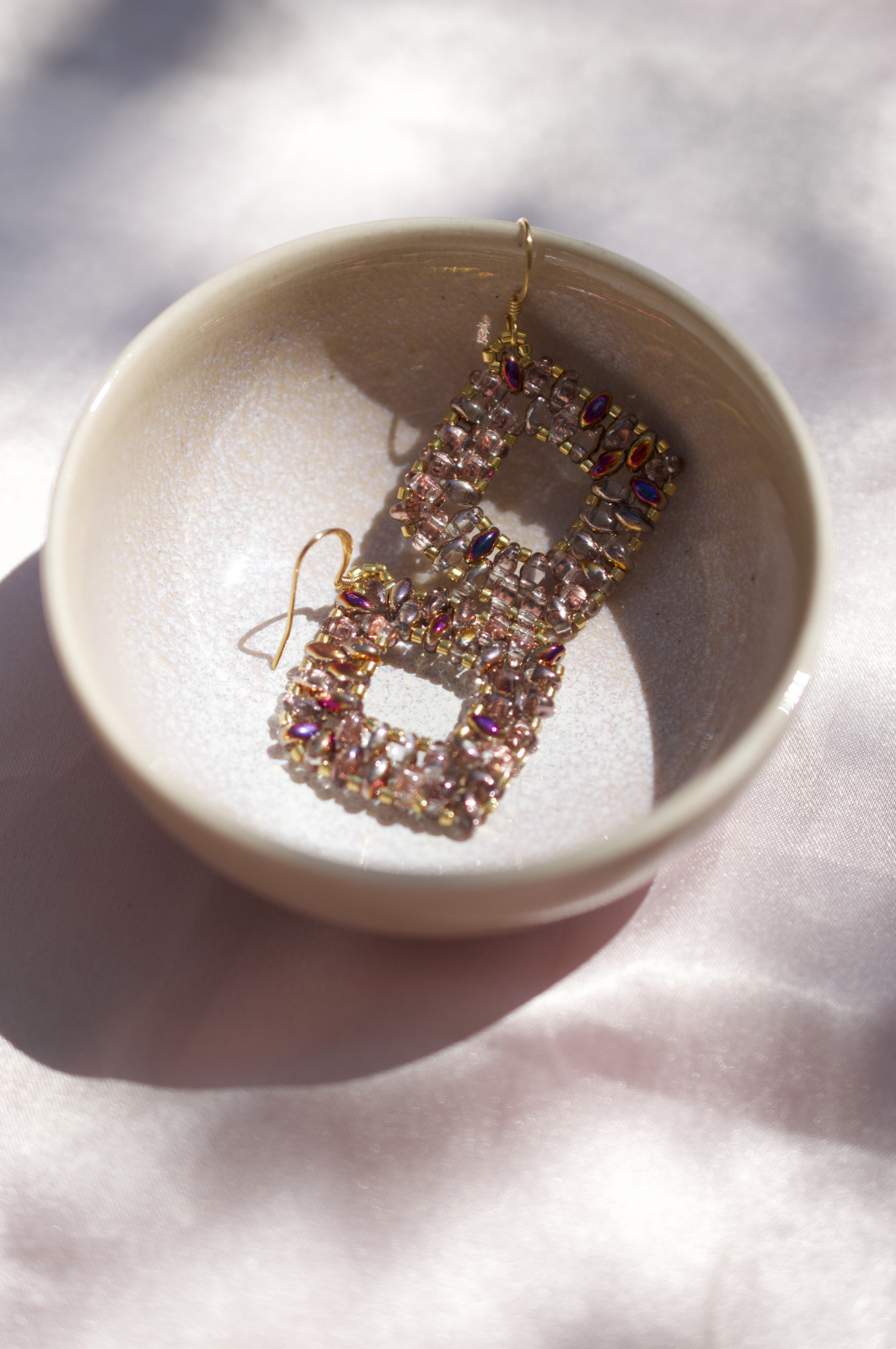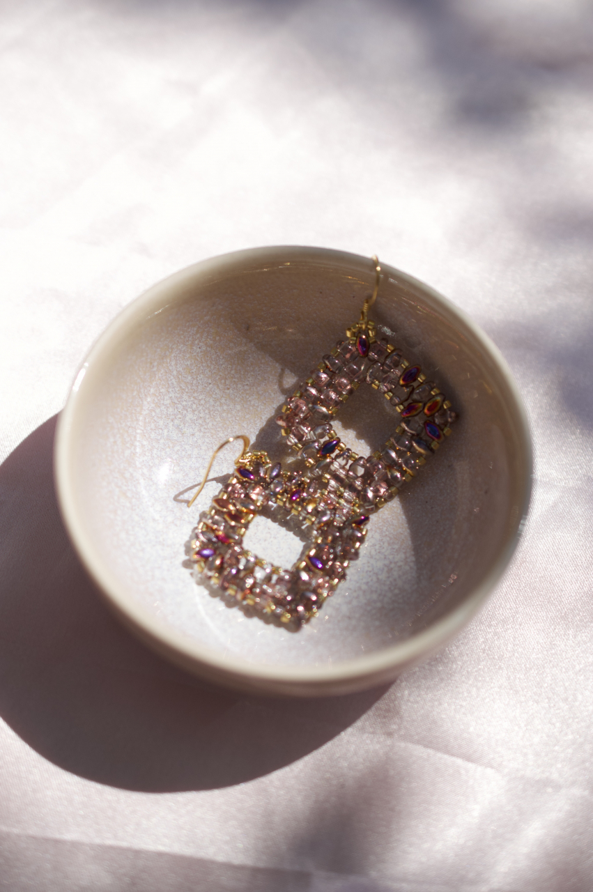 Acesti cercei realizati manual imbina rafinamentul cu indrazneala. Fiecare pereche este construita cu margele super duo in nuanta crystal sliperit, care reflecta lumina in nuante sofisticate de roz-purpuriu, auriu si lila. Margelele placate cu aur si tortitele placate cu aur accentueaza luxul discret al acestei piese.