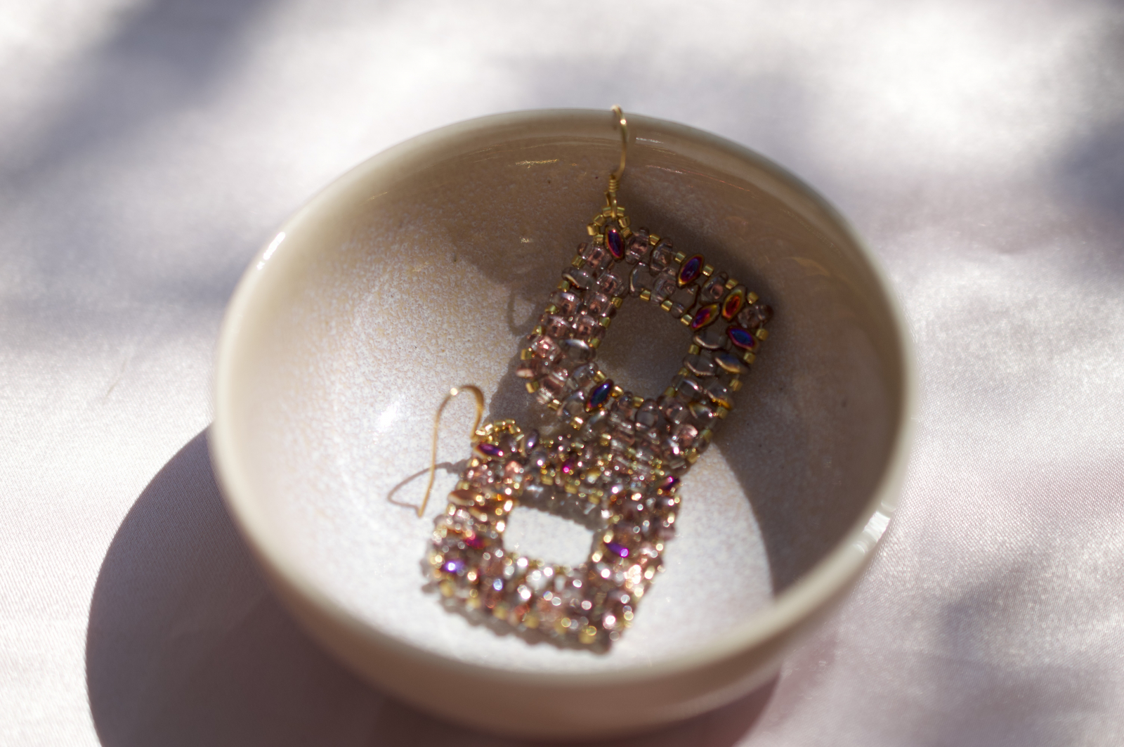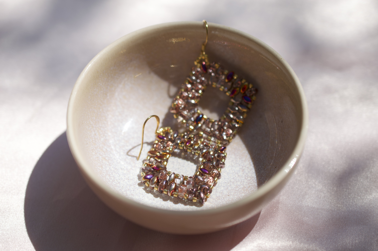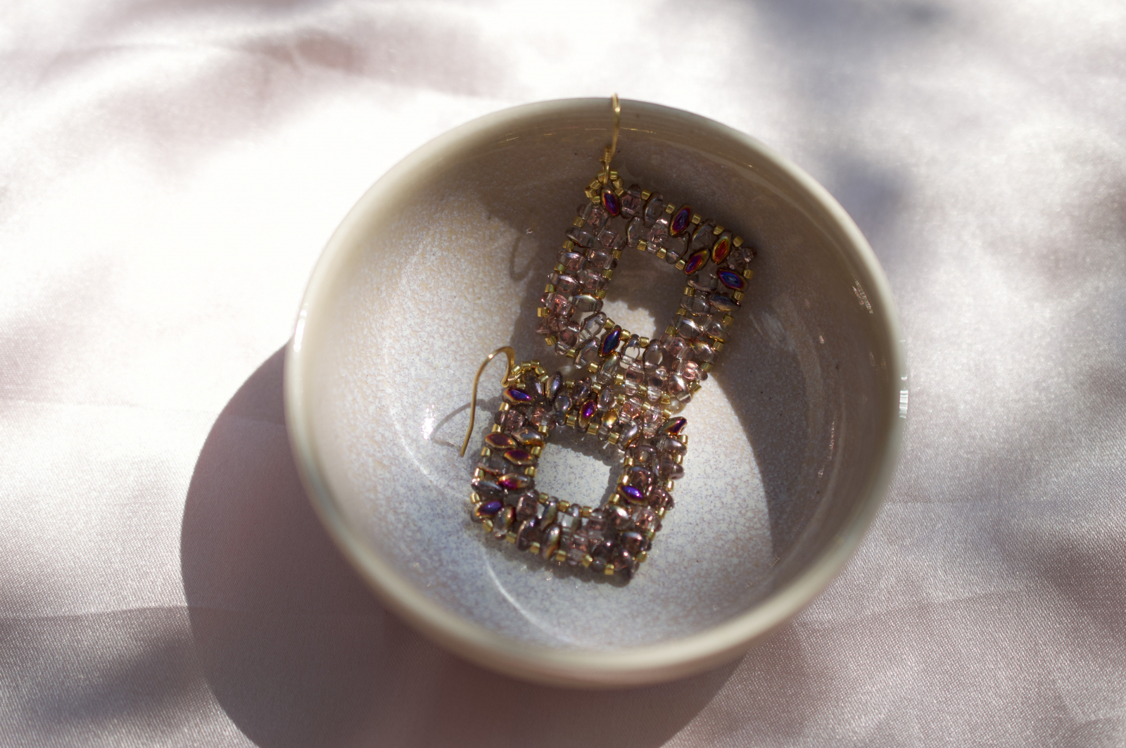 Acesti cercei realizati manual imbina rafinamentul cu indrazneala. Fiecare pereche este construita cu margele super duo in nuanta crystal sliperit, care reflecta lumina in nuante sofisticate de roz-purpuriu, auriu si lila. Margelele placate cu aur si tortitele placate cu aur accentueaza luxul discret al acestei piese.