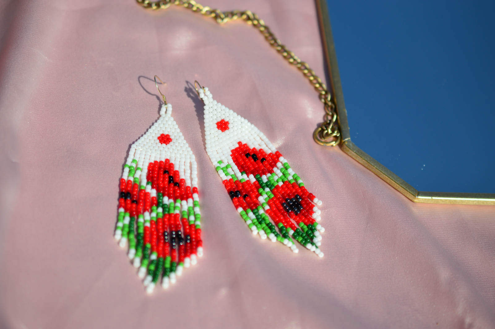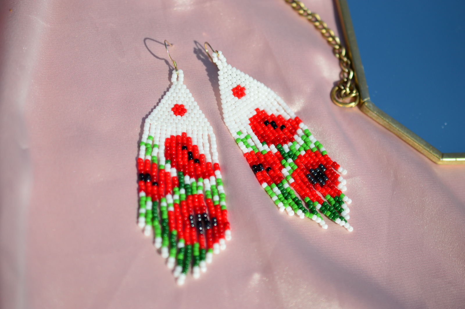 Cercei statement cu motiv floral inspirat de maci, lucrati manual din margele Toho / Delica. Modelul reda contrastul dintre rosul intens al florilor si fundalul alb, intr-un design clar, vizibil si foarte usor de purtat in tinute de zi sau de seara.