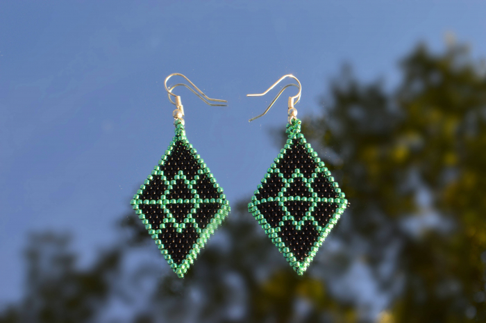 Cerceii Danielle sunt țesuți manual din mărgele Toho, într-un model geometric clar, cu linii curate și contrast vizual puternic. Forma romboidală și jocul de verde pe fundal închis creează un efect grafic elegant, ușor de purtat ziua, dar suficient de interesant pentru seară.