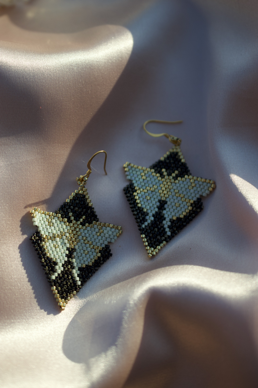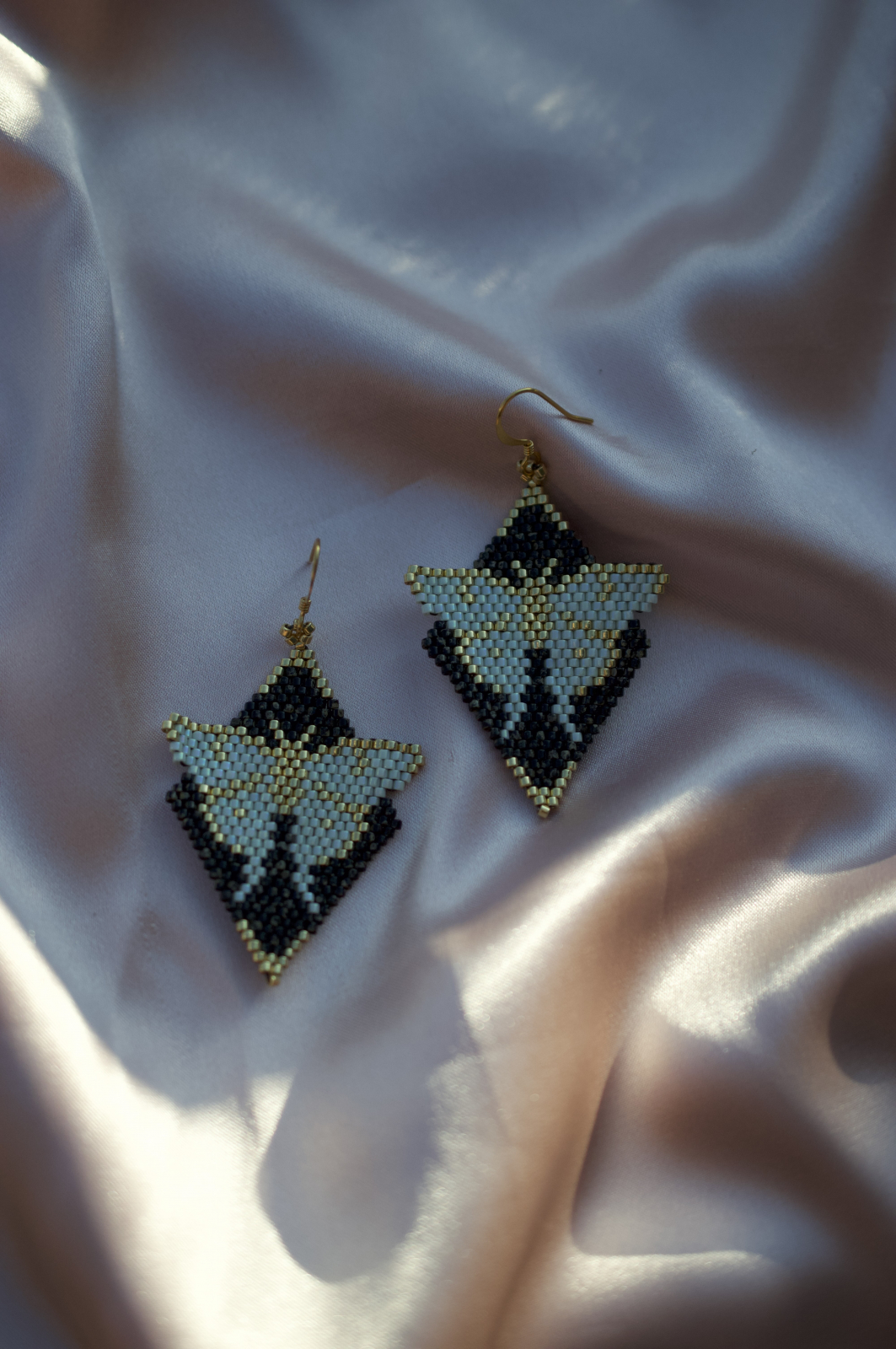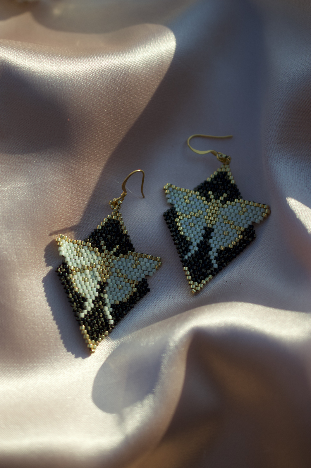 Intr-o armonie perfecta de contraste si simboluri, cerceii Elyra surprind zborul delicat al unui fluture sculptat in margele cu finisaj auriu, turquoise deschis si negru intens. Designul geometric, precis si aerat, aminteste de o poveste in care fragilitatea si puterea danseaza impreuna.