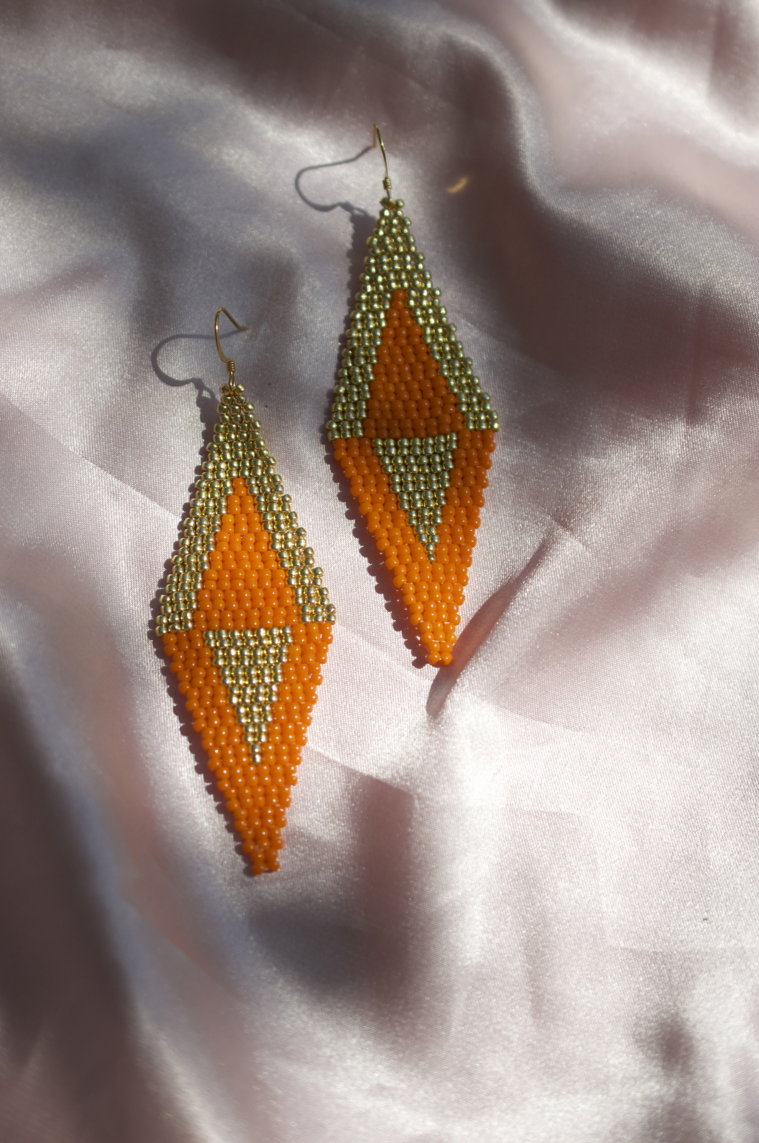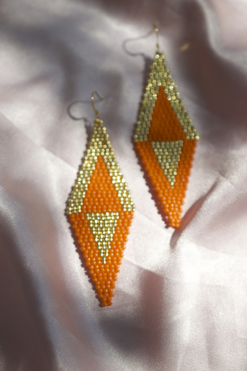 Cerceii Geometric Flame imbina indrazneala culorii portocalii cu eleganta margelelor aurii, creand un contrast vibrant si sofisticat. Realizati manual cu atentie la detalii, acesti cercei statement au o forma alungita de diamant, care subtiaza vizual linia gatului. Cu o lungime de 8 cm si latime de 2.8 cm, sunt usori si confortabili de purtat. Tortitele placate cu aur completeaza designul modern si rafinat. Poarta-i cu incredere la evenimente speciale sau adauga o nota artistica tinutelor de zi cu zi.
