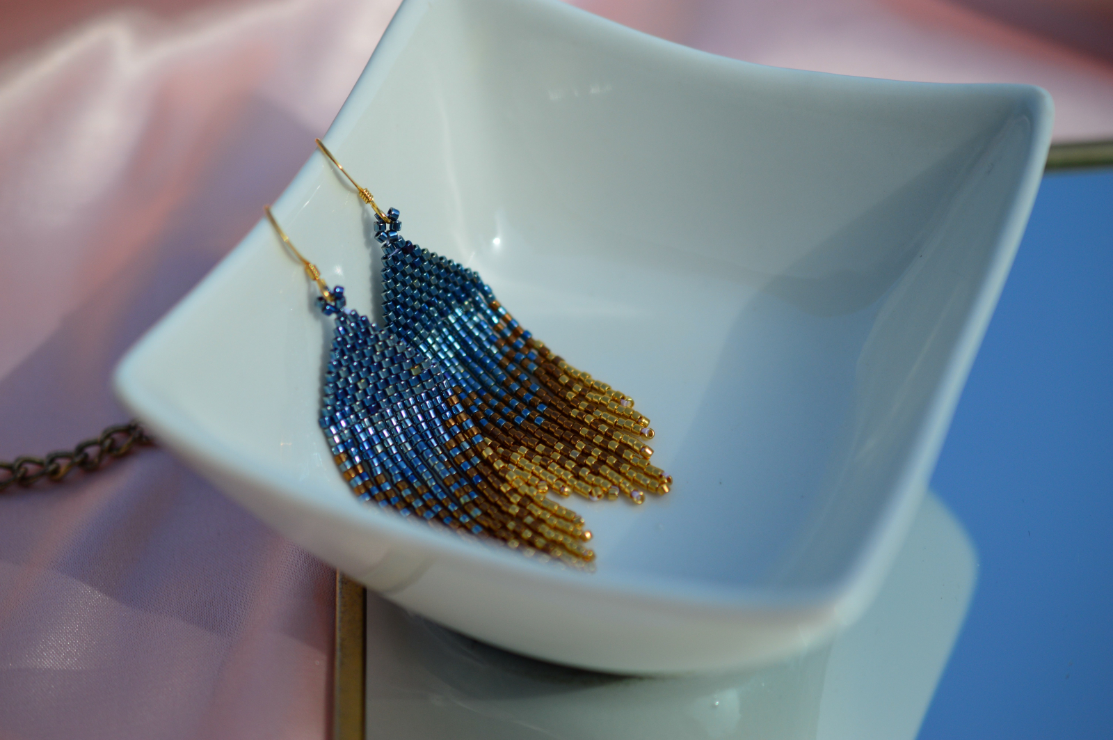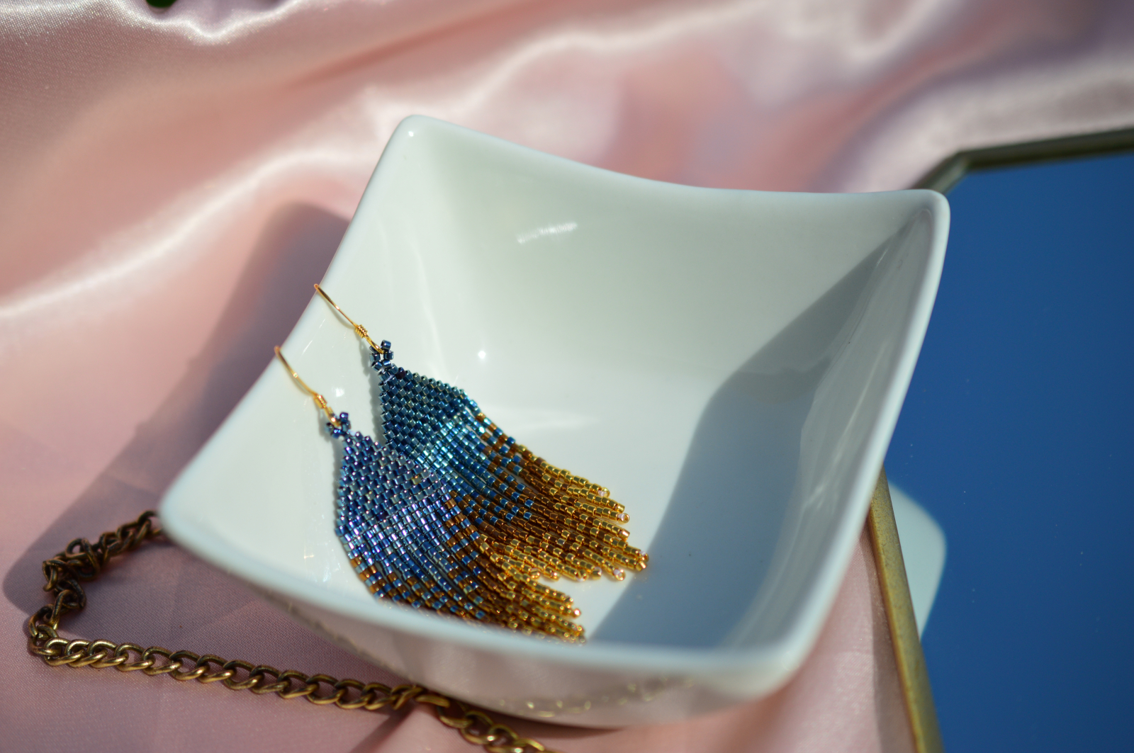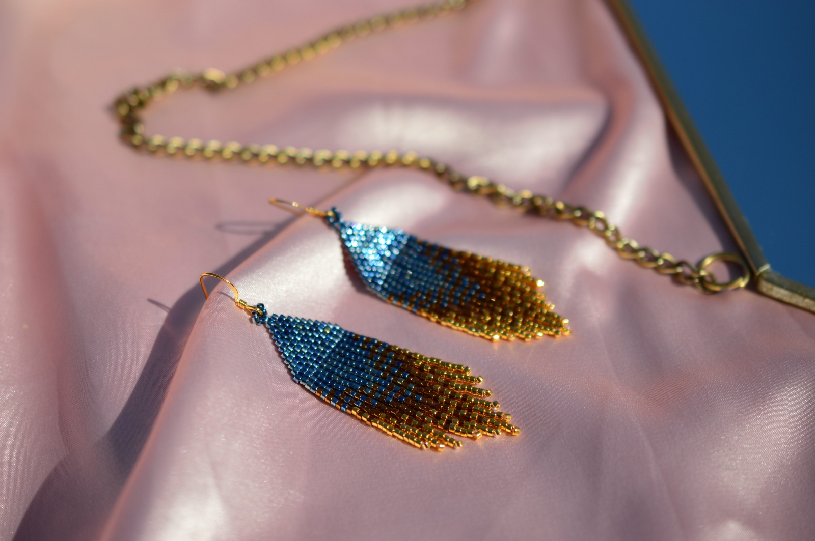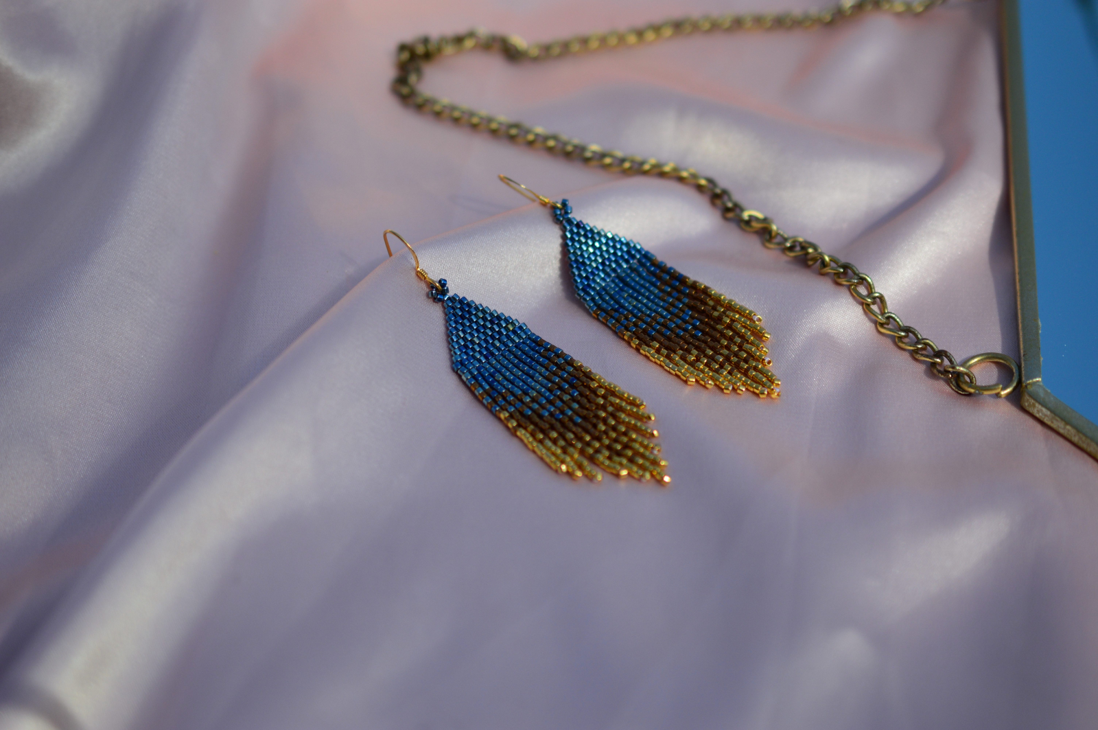 Cercei statement realizati manual, cu silueta alungita si textura fluida, inspirati de frunzele aurii si nuantele de albastru intens. Sunt ganditi ca piese verticale, elegante, care alungesc vizual linia gatului si dau tinutei un aer puternic, aproape regal.