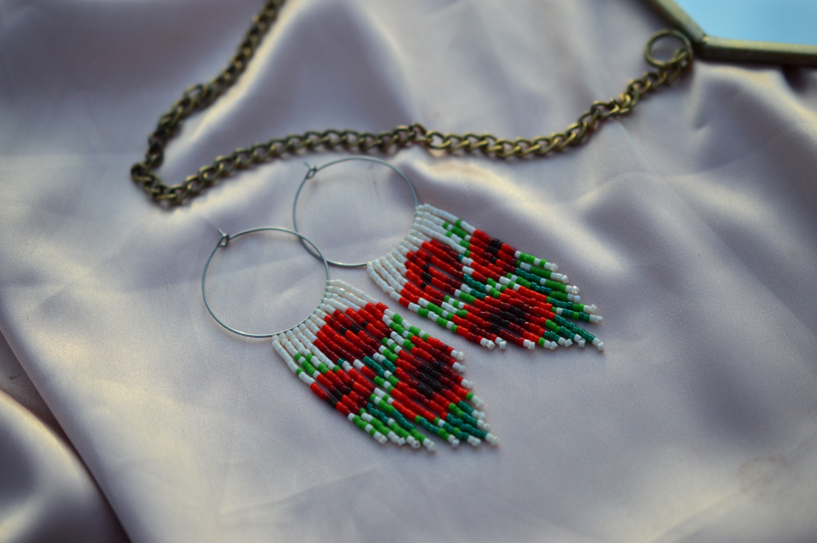 Un model care aduce vara pe lobul urechii. Macii brodati din margele creeaza un contrast intens intre rosu aprins si verdele frunzelor, asezate pe un cerc subtire care lasa modelul sa pluteasca vizual.