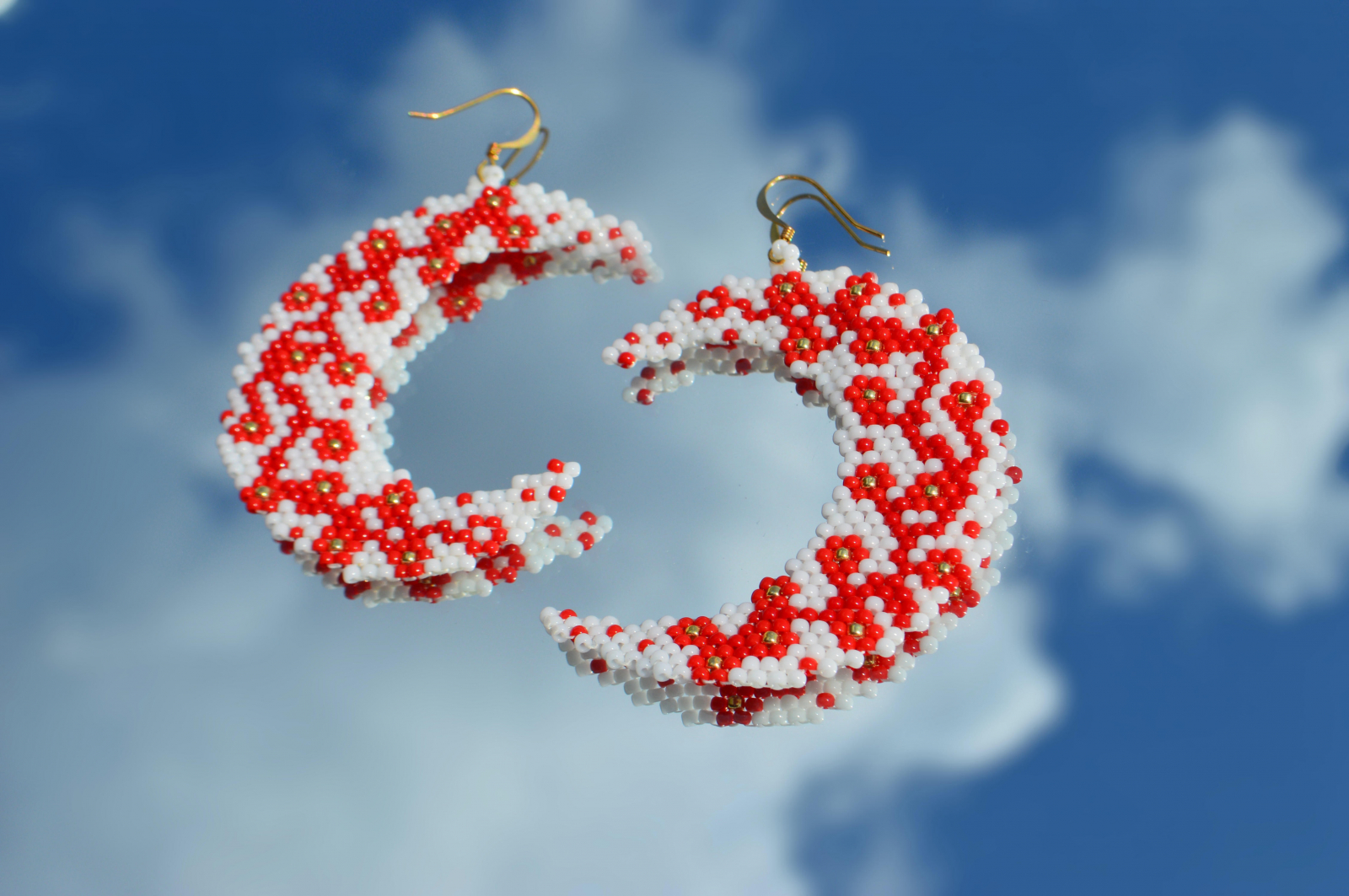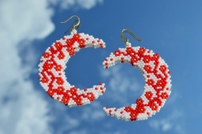 Cerceii Luna au o forma rotunda, deschisa, inspirata de silueta lunii, construita din margele cusute manual una cate una. Textura lor aerata si culoarea intensa ii fac vizibili, dar usori de purtat.