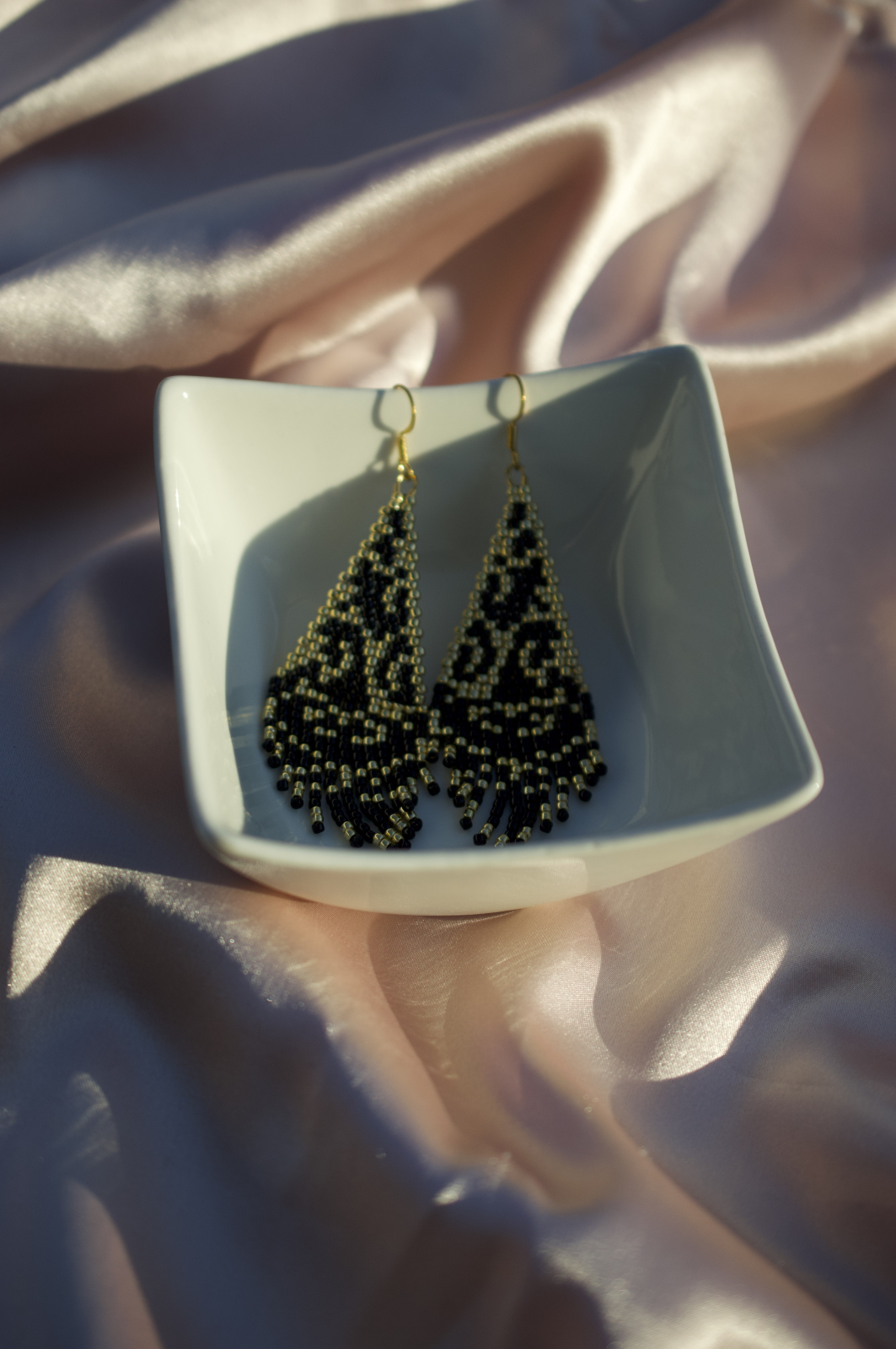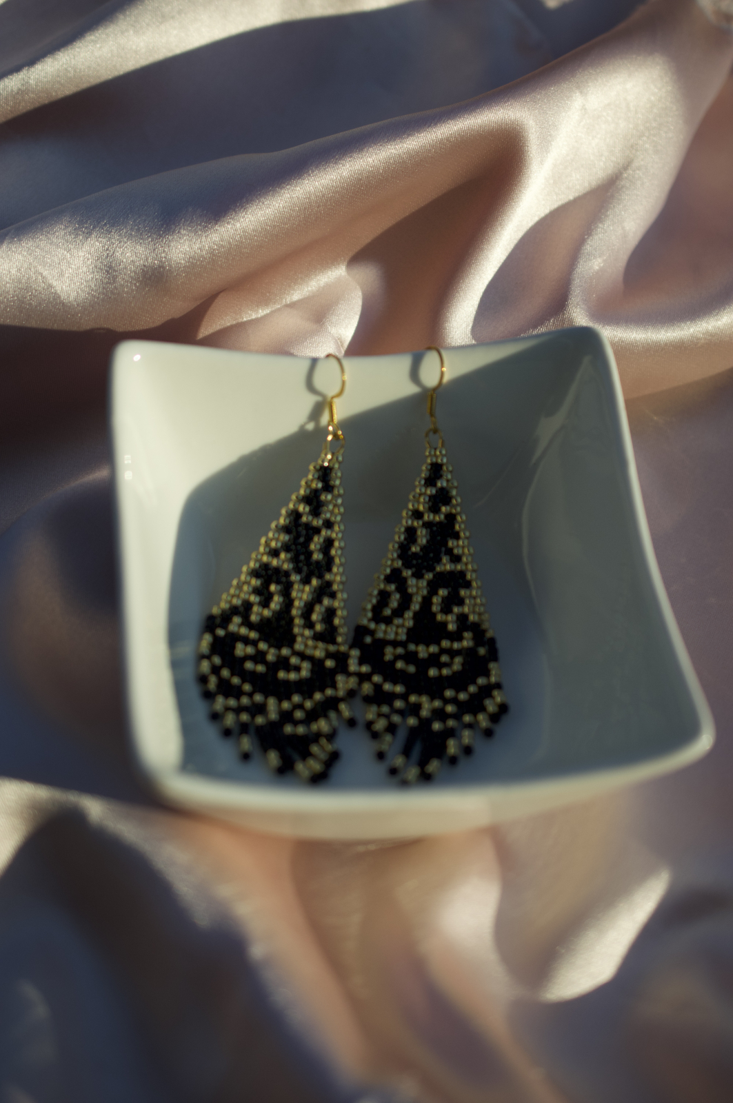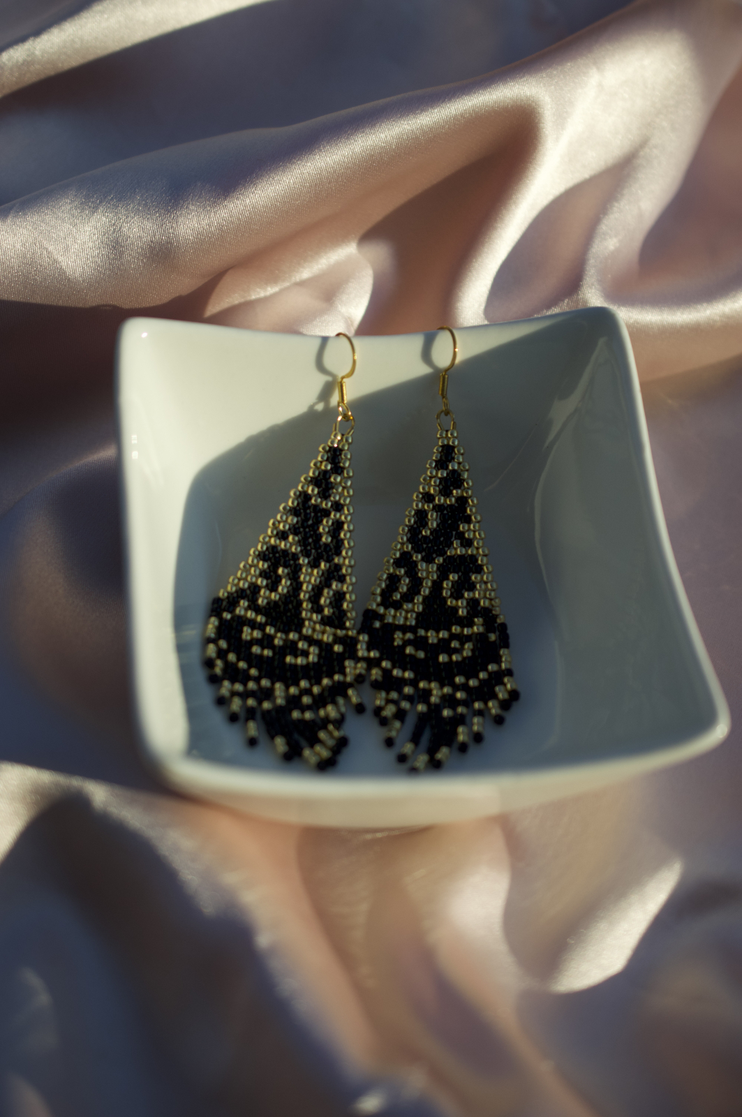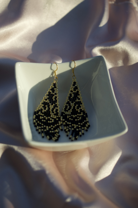 Cerceii Nocturna sunt creati manual pentru femeia care iubeste eleganta misterioasa si accentele de lux. Realizati cu margele atent selectate si tortite placate cu aur, acesti cercei de dimensiune medie (7.5 cm lungime, 2.5 cm latime) impresioneaza prin modelul lor rafinat, ce combina negrul intens cu detalii aurii stralucitoare.