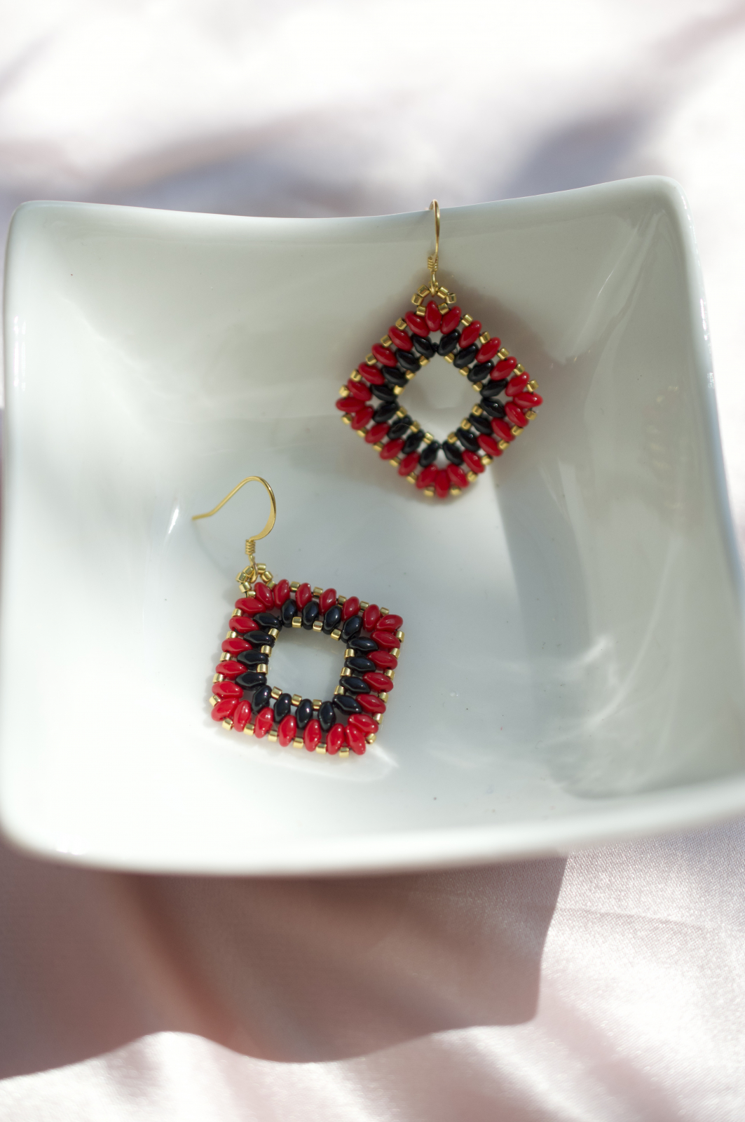 Un statement elegant si indraznet! Cerceii Red Obsidian sunt realizati manual din margele super duo negre si rosii, conturate cu margelute placate cu aur. Designul geometric in forma de patrat scos in evidenta de combinatia cromatica intensa, transmite putere si rafinament. Un accesoriu usor, dar cu impact vizual garantat.
