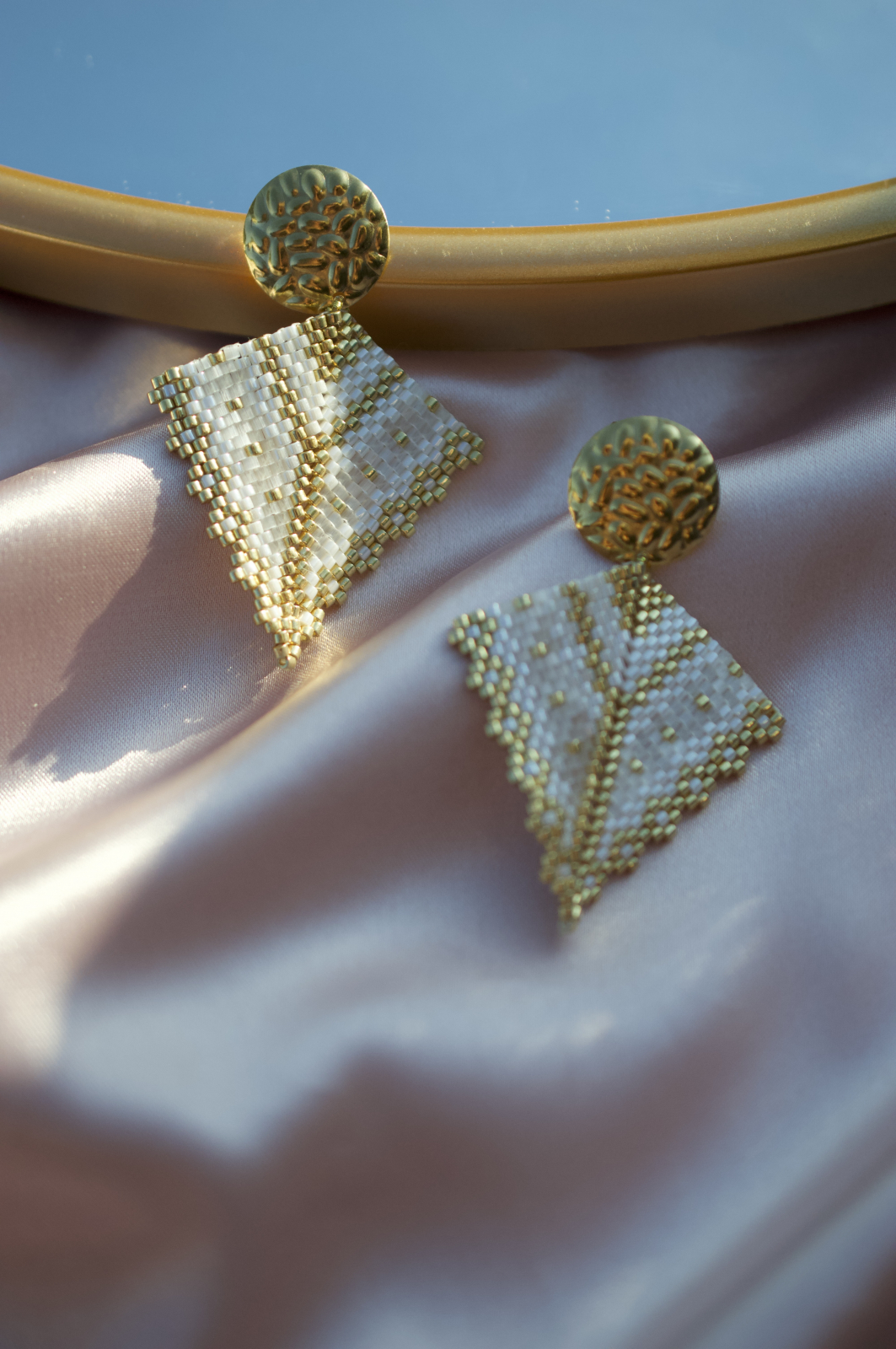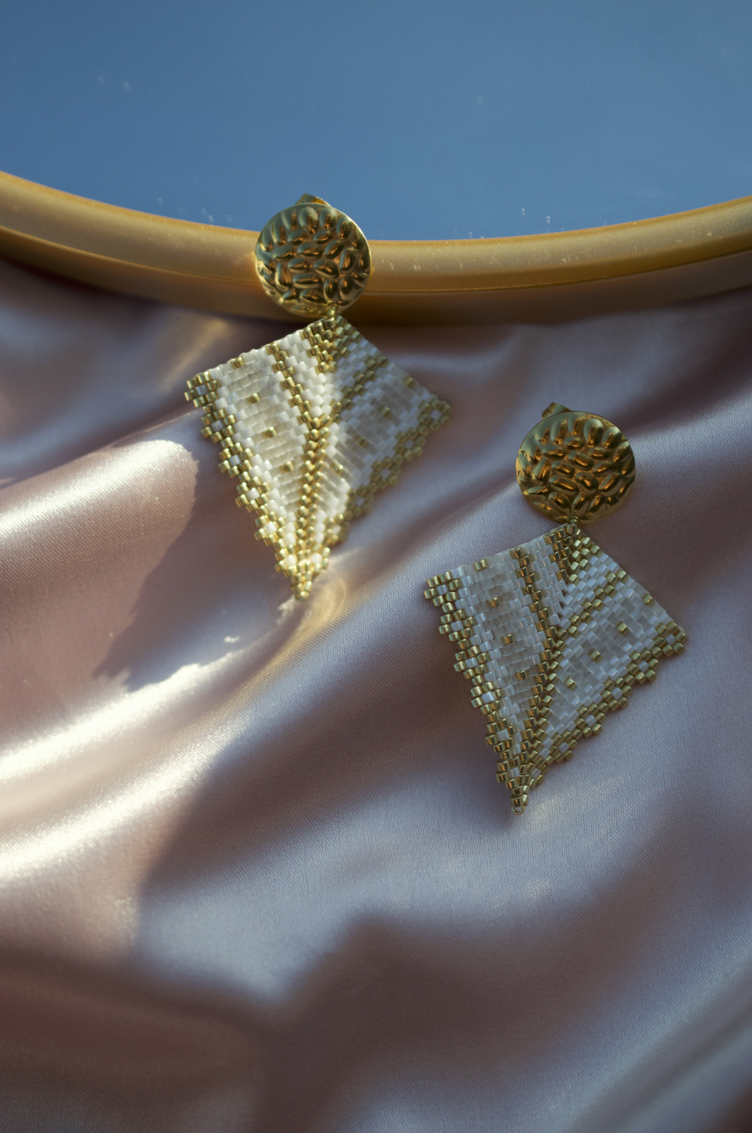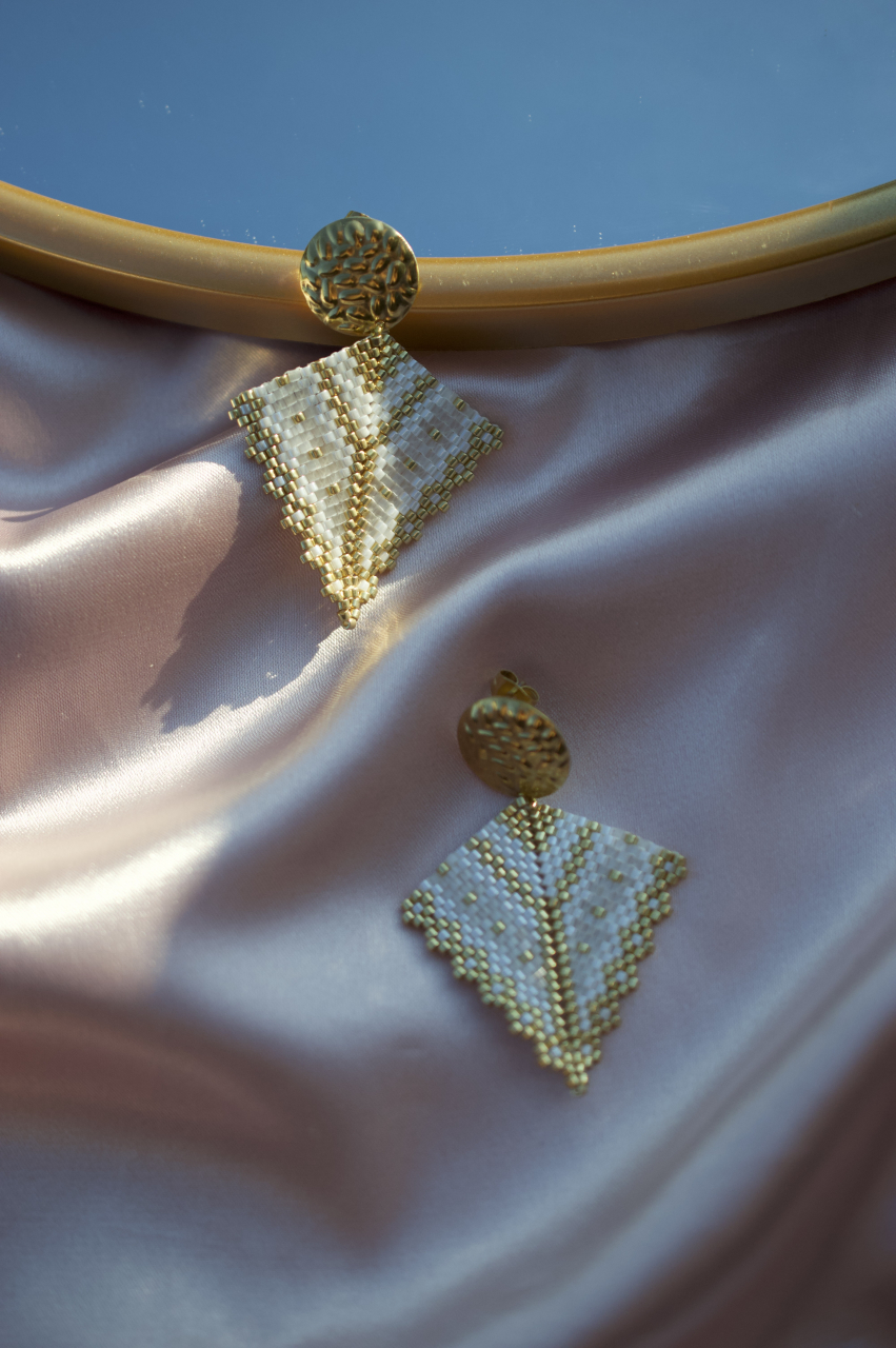Realizati din margele Delica de cea mai buna calitate, placate cu aur, si completati de o tortita tip platou cu surub, la fel de aurie si texturata, Soleia transforma orice aparitie intr-una memorabila.