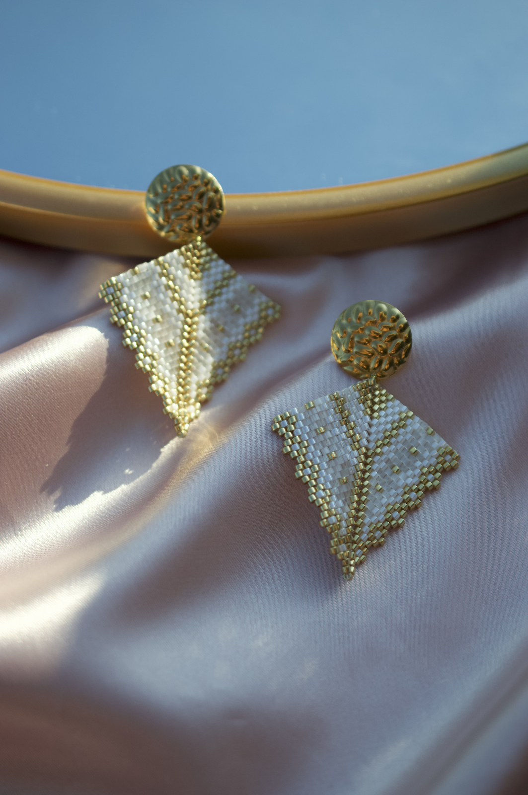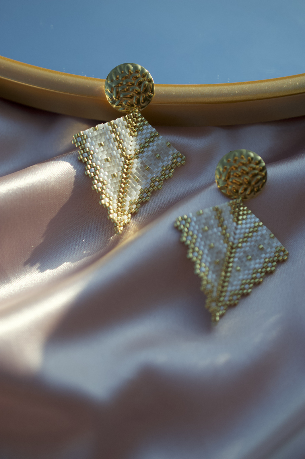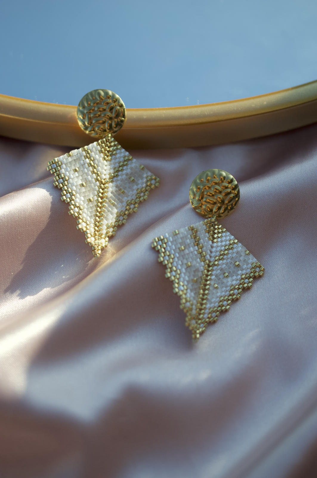 Realizati din margele Delica de cea mai buna calitate, placate cu aur, si completati de o tortita tip platou cu surub, la fel de aurie si texturata, Soleia transforma orice aparitie intr-una memorabila.