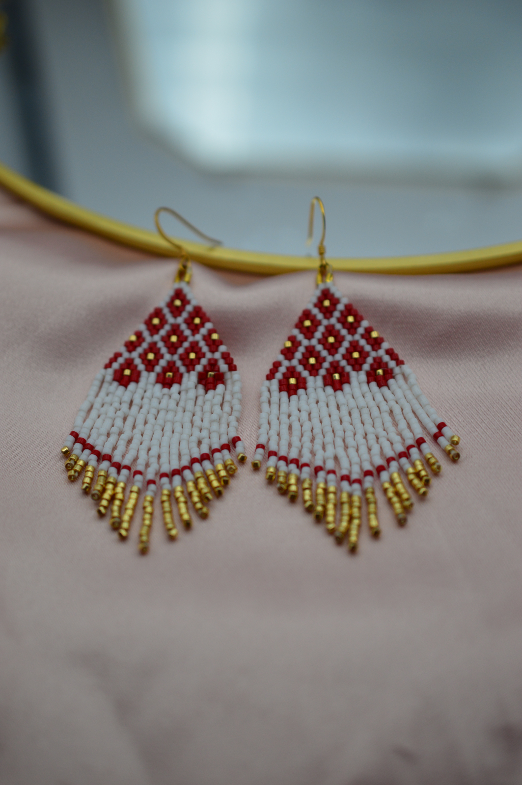 Inspirati din motivele romanesti clasice, acesti cercei aduc un aer autentic si puternic in orice tinuta. Modelul geometric si franjurile aurii creeaza o combinatie care aminteste de costumele populare, reinterpretate intr-o forma moderna si usor de purtat.