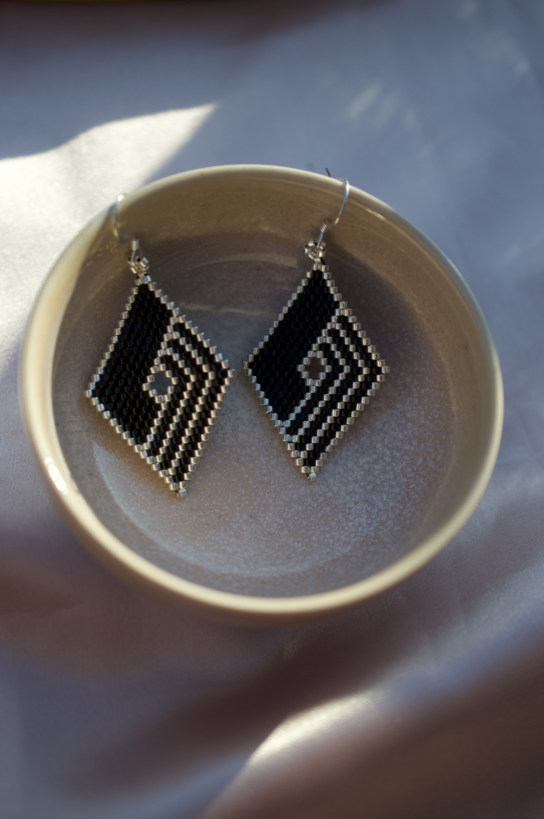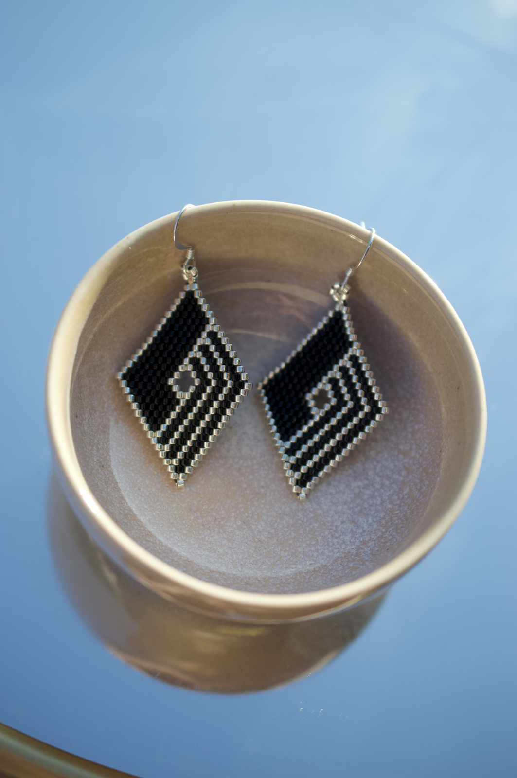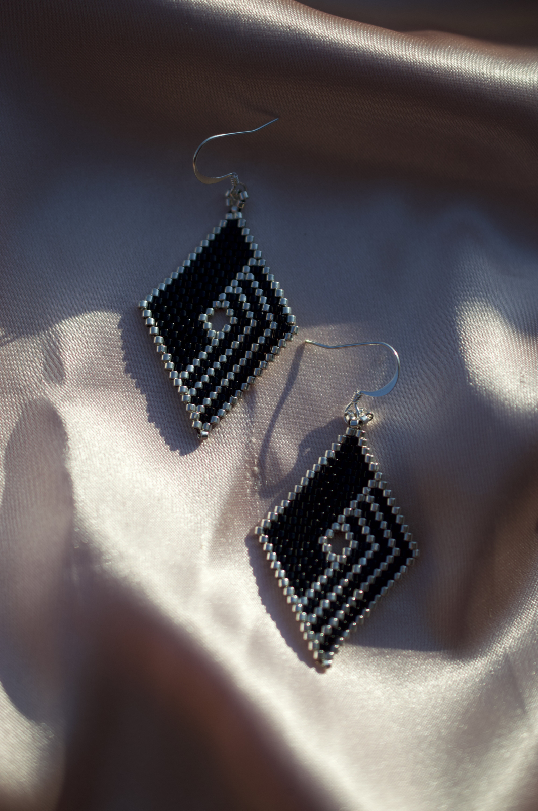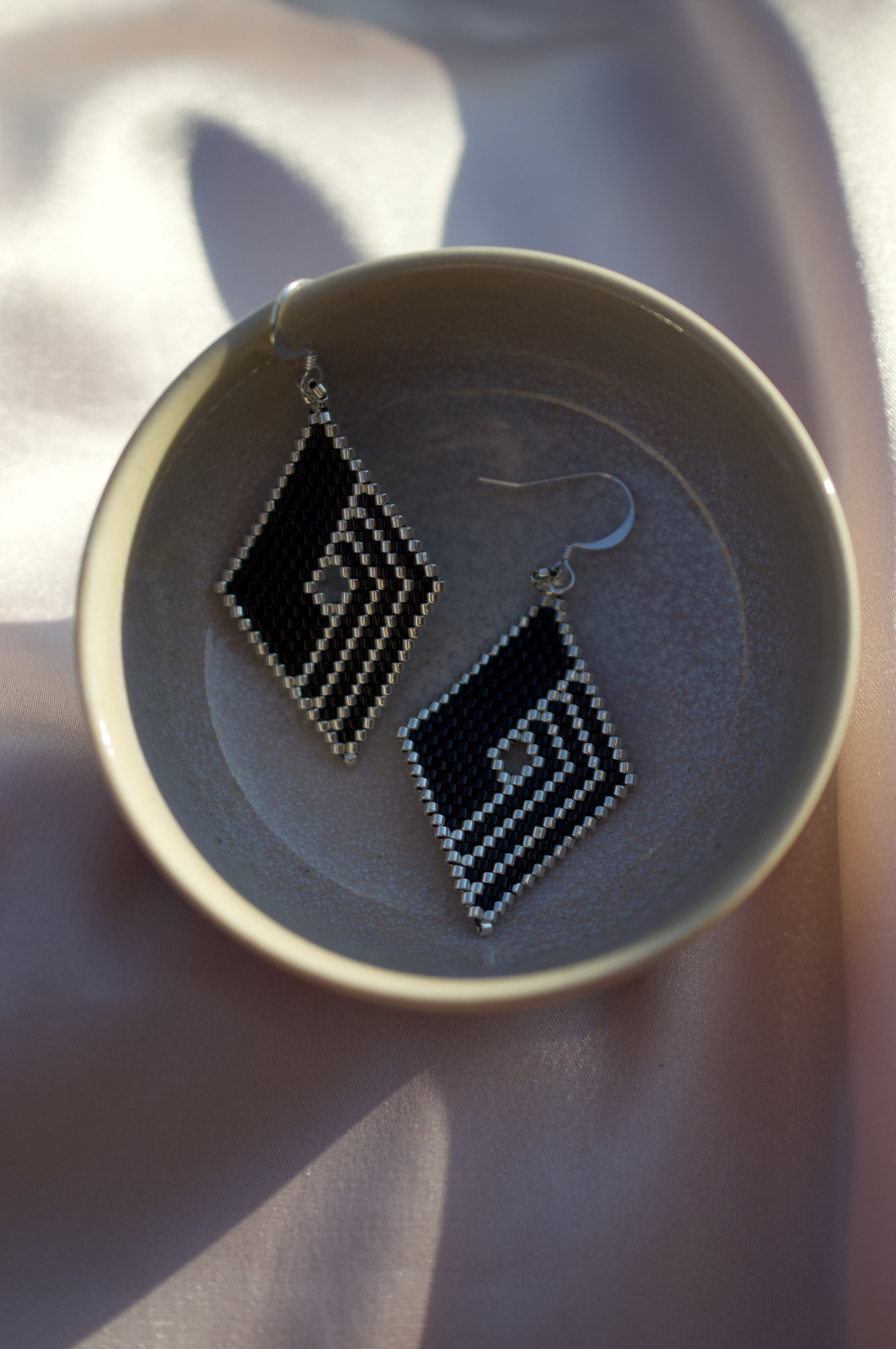 Cerceii Thalassa sunt o declaratie de rafinament si contrast. Fiecare detaliu este lucrat manual din margele Delica Miyuki de inalta calitate, in nuante de negru intens si margele placate cu argint, intr-un model geometric care capteaza lumina la fiecare miscare. Tortitele sunt placate cu argint pentru un plus de eleganta si confort.