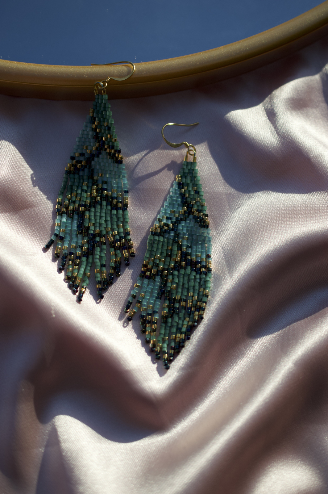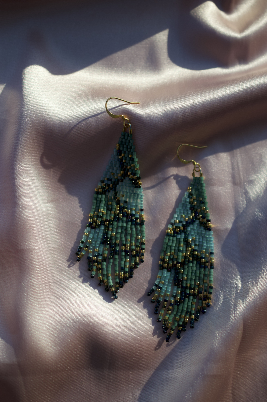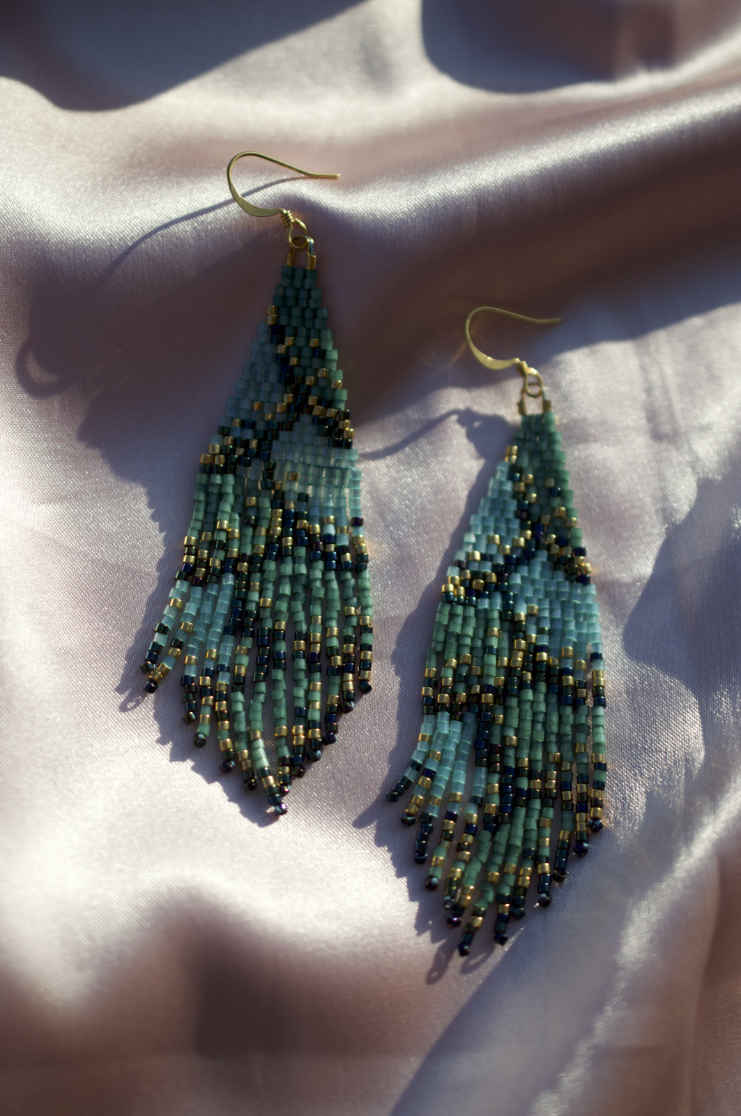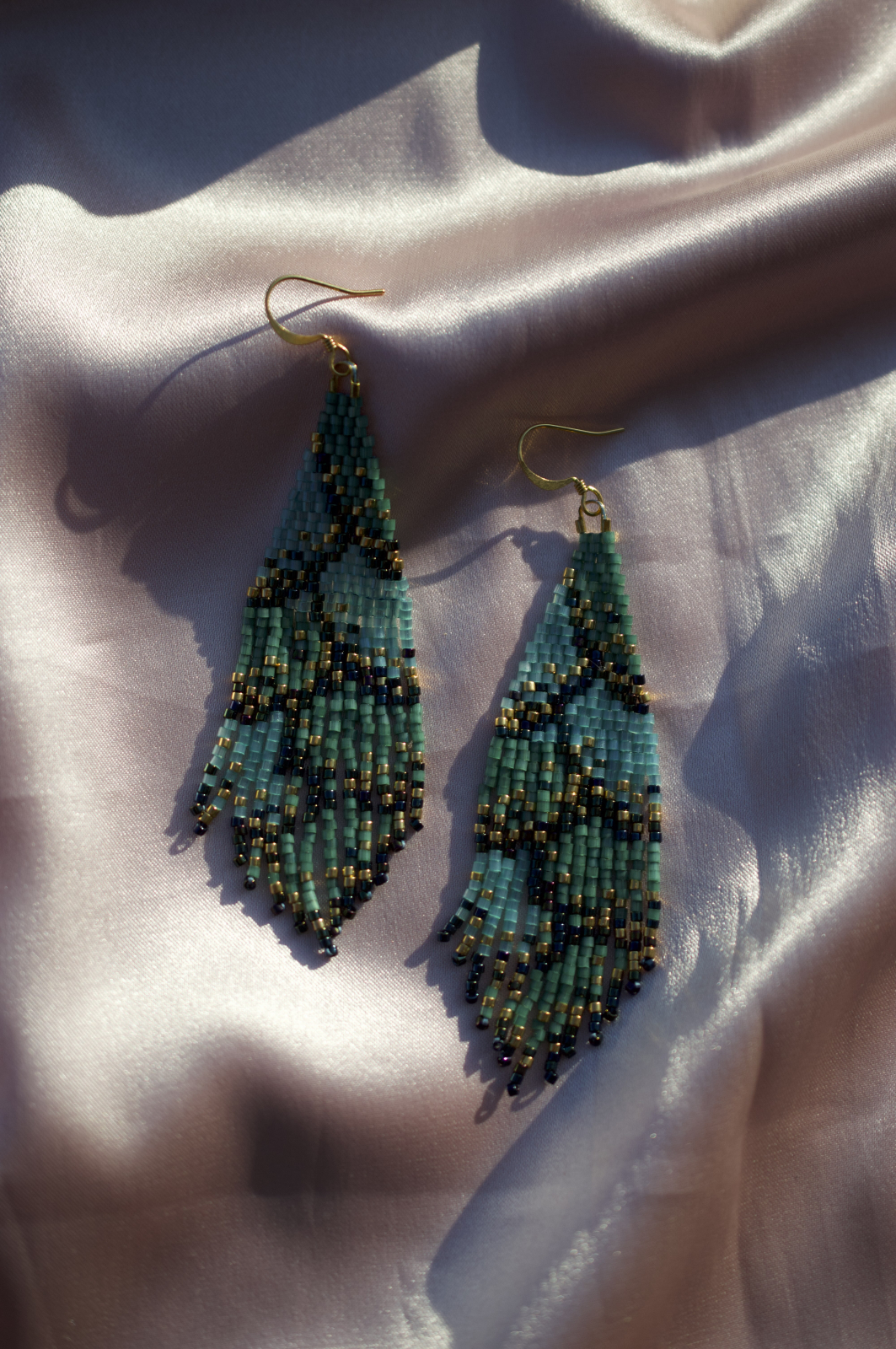 Descopera echilibrul dintre natura si eleganta in cerceii handmade Oceania. Creati manual cu migala din margelute japoneze Miyuki Delica, acest model reda armonia culorilor marine si a valurilor stilizate, imbogatite cu accente aurii.