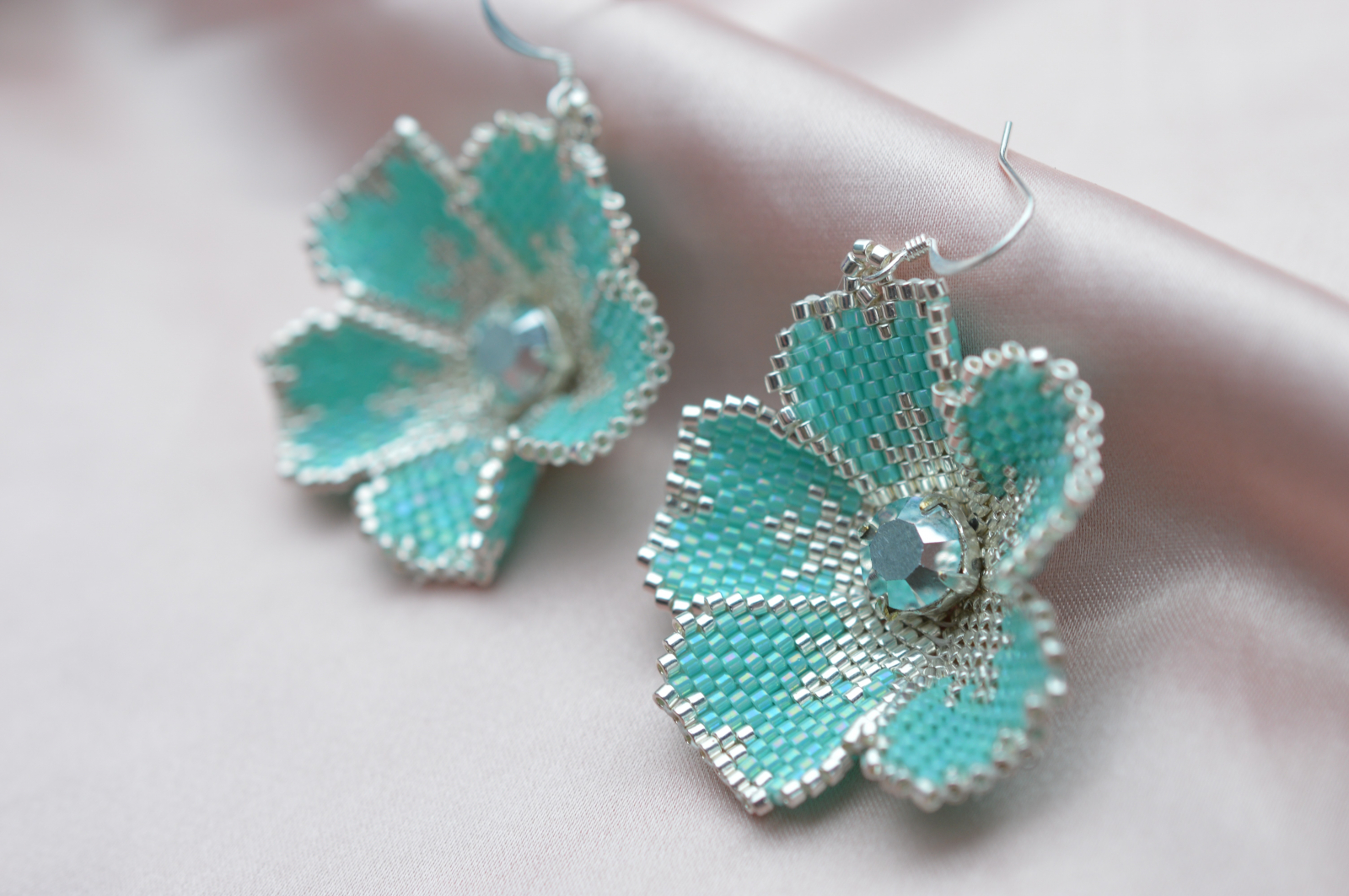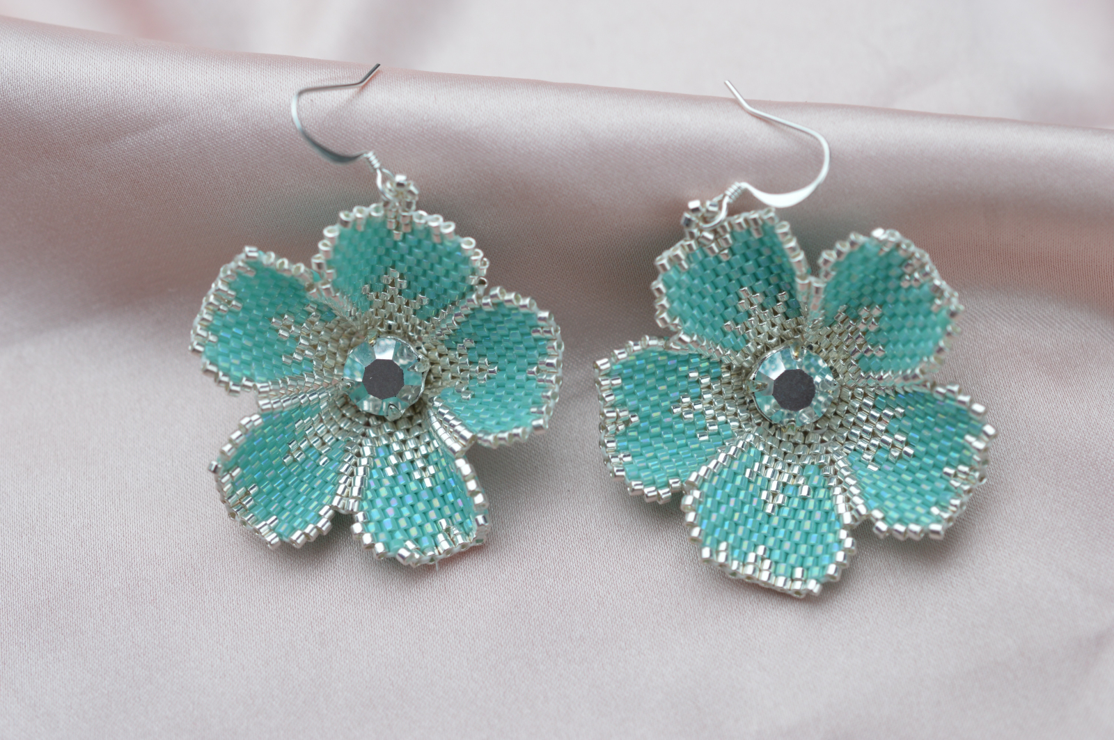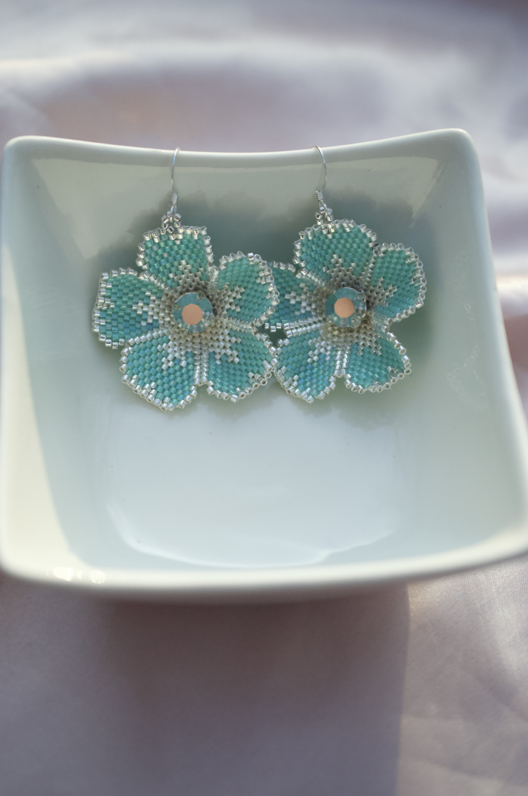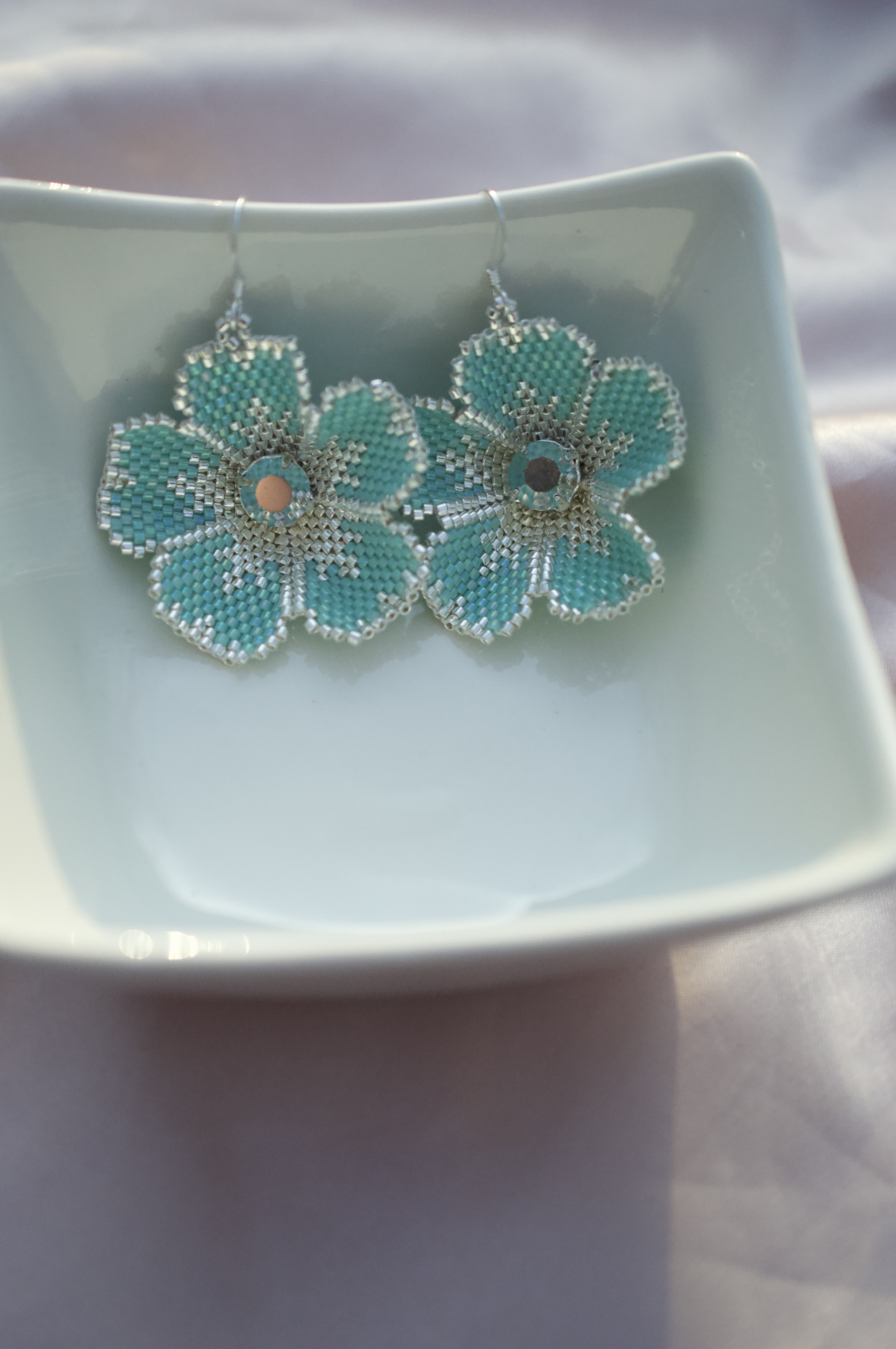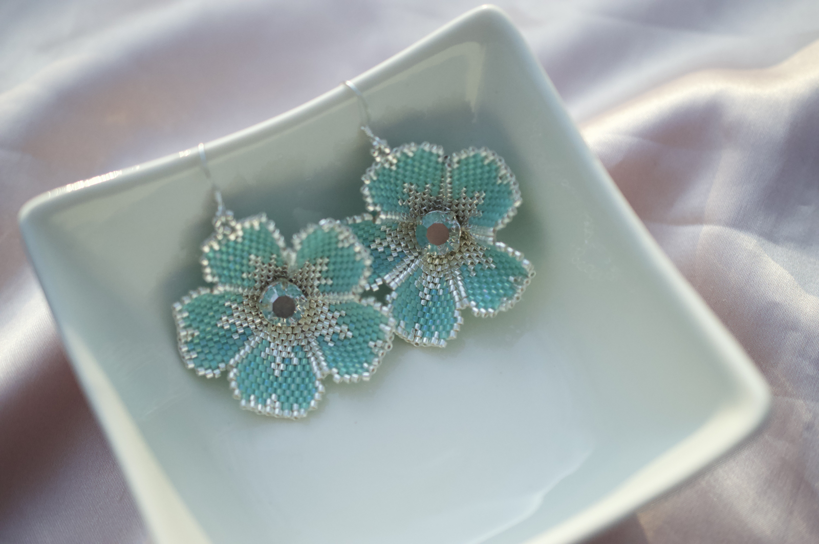 Cercei delicati cu flori albastru deschis, confectionati cu margele placate cu argint si cristale Swarovski in mijloc pentru un efect stralucitor si elegant.
