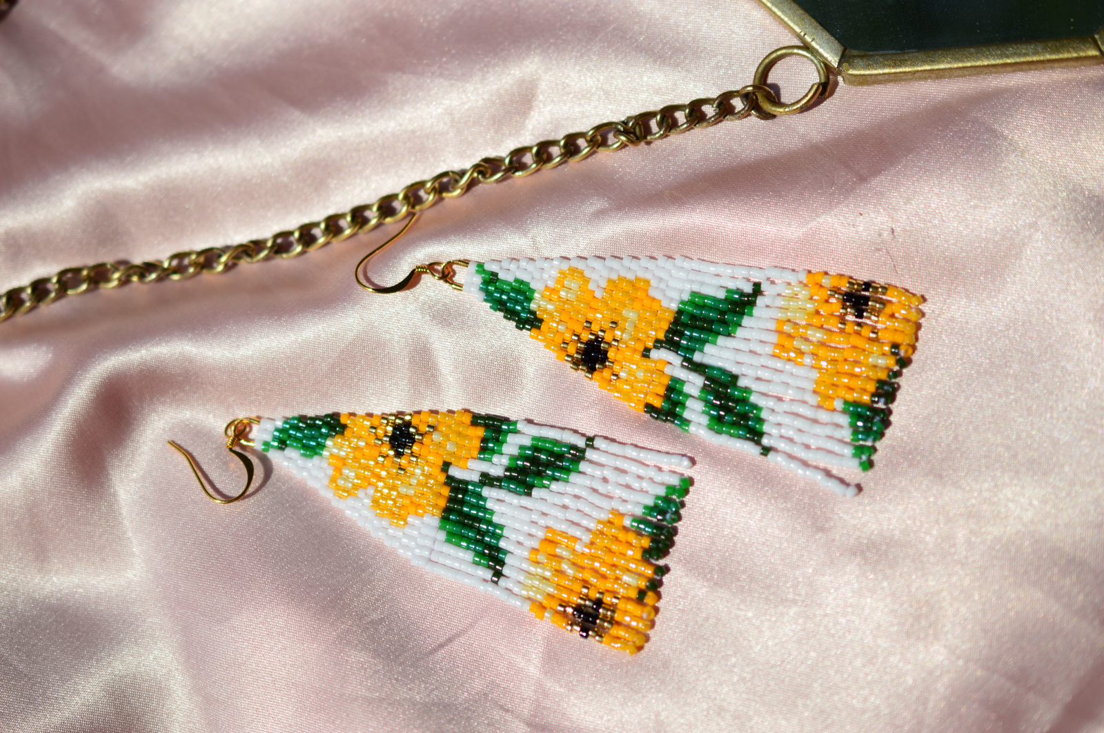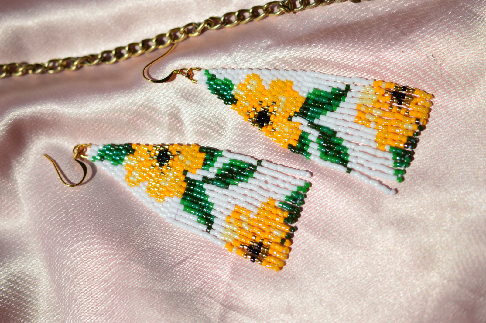 Cercei realizati manual din margele Miyuki Delica, cu model floral stilizat si contrast placut de culori. Sunt usori, au o forma alungita si evidentiaza frumos trasaturile fetei. Pot fi purtati zilnic, dar si in tinute mai atent construite.