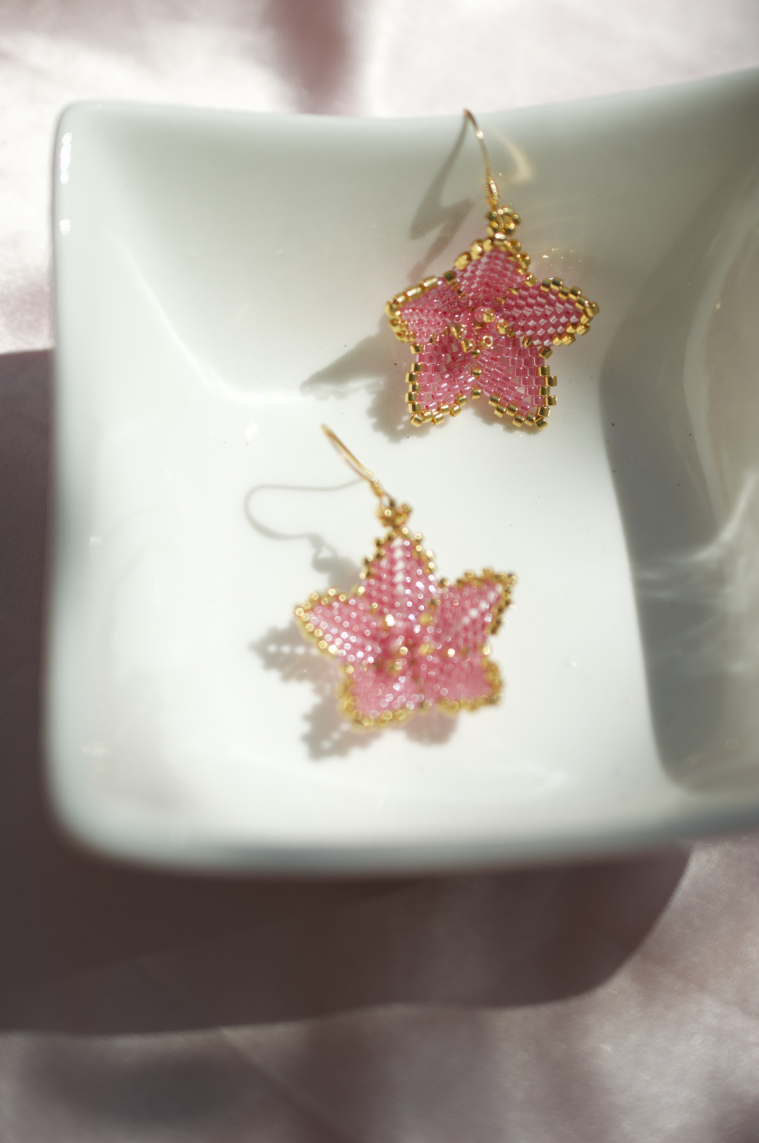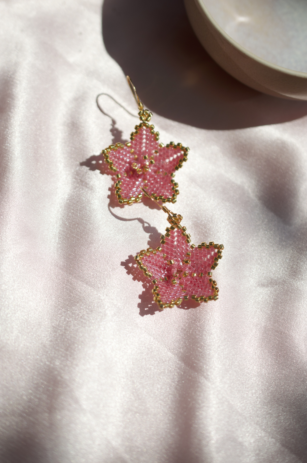 Cerceii Sakura Bloom sunt realizati manual cu margele Miyuki Delica roz si conturati cu margele placate cu aur pentru un efect luminos si elegant. Forma florala inspirata de floarea de cires adauga delicatete si prospetime fiecarei tinute.