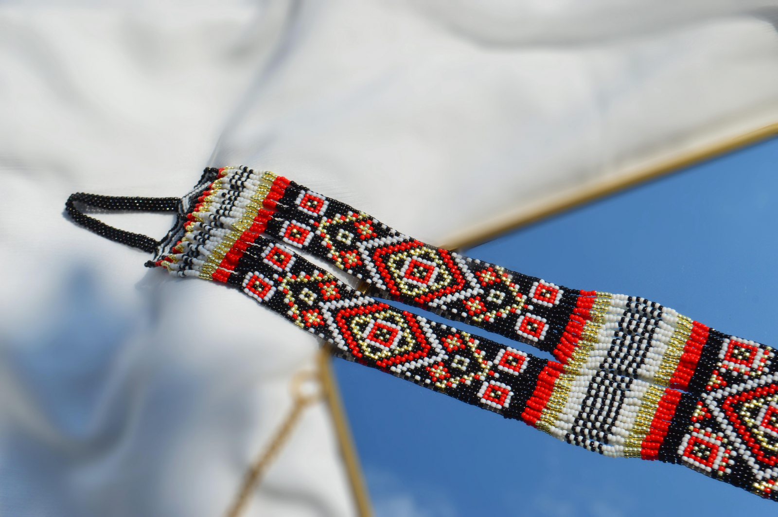 Camille este un colier tesut integral manual, din margele mici, cusute una cate una, in motive geometrice cu influente traditionale. Este o piesa lunga, fluida, care se aseaza pe bust si alungeste vizual silueta.