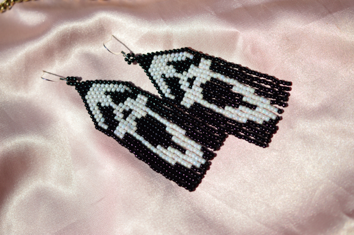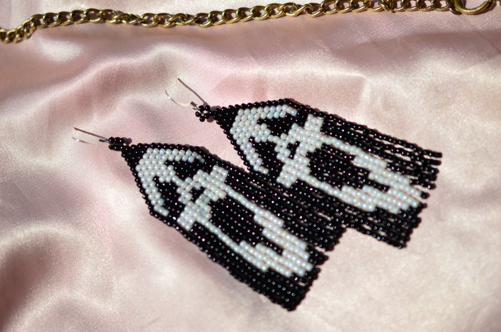 Cercei statement realizati manual din margele japoneze Toho, cu un design grafic alb-negru inspirat de Ghost Face. Contrastul puternic si forma alungita transforma aceasta pereche intr-un accent vizual care nu trece neobservat.